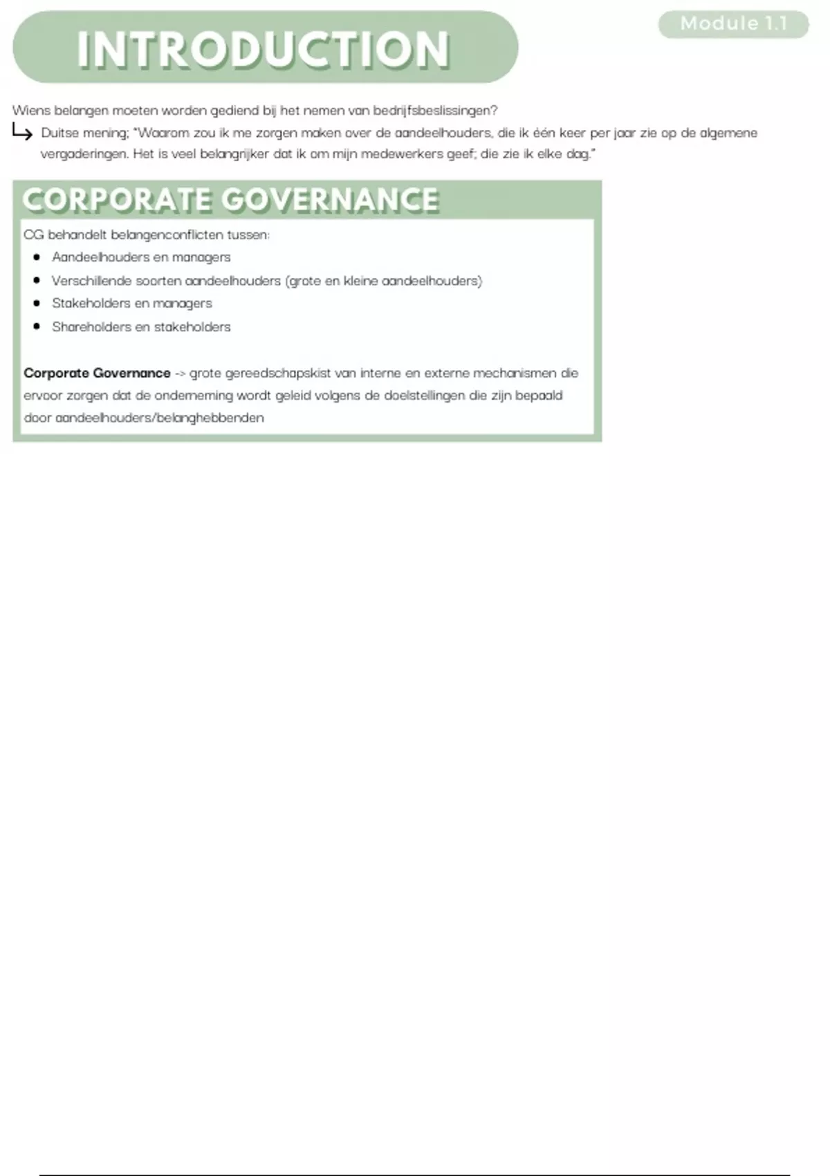 Corporate Governance -> grote gereedschapskist van interne en externe mechanismen die