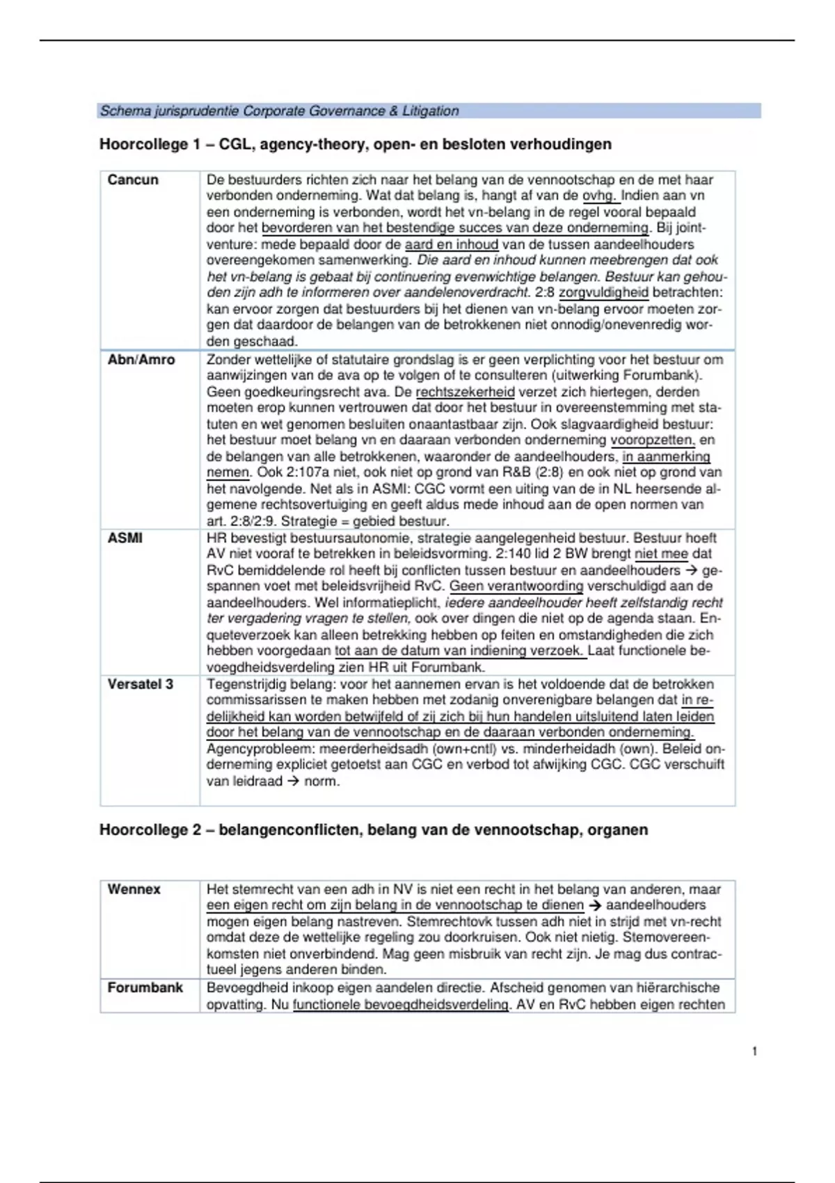 Samenvatting alle arresten Corporate Governance & Litigation per hoorcollege. Ik heb zelf een 9.2 gehaald met deze samenvatting. Geprint mee te nemen naar het tentamen.