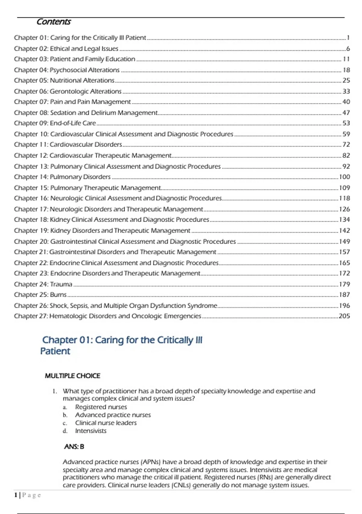 Test Bank Priorities in Critical Care Nursing 8th edition Urden Stacy LoughContents Chapter 01: Caring for the Critically Ill Patient .................................................................................................................................. 1 Chapter 02: Ethical and Legal Issues .................................................................................................................................................... 6 Chapter 03: Patient and Family Education ...................................................................................................................................... 11 Chapter 04: Psychosocial Alterations ................................................................................................................................................ 18 Chapter 05: Nutritional Alterations .................................................................................................................................................... 25 Chapter 06: Gerontologic Alterations ............................................................................................................................................... 33 Chapter 07: Pain and Pain Management ......................................................................................................................................... 40 Chapter 08: Sedation and Delirium Management ........................................................................................................................ 47 Chapter 09: End-of-Life Care ................................................................................................................................................................ 53 Chapter 10: Cardiovascular Clinical Assessment and Diagnostic Procedures ...................................................................... 59 Chapter 11: Cardiovascular Disorders ............................................................................................................................................... 72 Chapter 12: Cardiovascular Therapeutic Management............................................................................................................... 82 Chapter 13: Pulmonary Clinical Assessment and Diagnostic Procedures .............................................................................. 92 Chapter 14: Pulmonary Disorders .................................................................................................................................................... 100 Chapter 15: Pulmonary Therapeutic Management.................................................................................................................... 109 Chapter 16: Neurologic Clinical Assessment and Diagnostic Procedures ............................................................................ 118 Chapter 17: Neurologic Disorders and Therapeutic Management ........................................................................................ 126 Chapter 18: Kidney Clinical Assessment and Diagnostic Procedures .................................................................................... 134 Chapter 19: Kidney Disorders and Therapeutic Management ................................................................................................ 142 Chapter 20: Gastrointestinal Clinical Assessment and Diagnostic Procedures .................................................................. 149 Chapter 21: Gastrointestinal Disorders and Therapeutic Management ............................................................................... 157 Chapter 22: Endocrine Clinical Assessment and Diagnostic Procedures .............................................................................. 165 Chapter 23: Endocrine Disorders and Therapeutic Management .......................................................................................... 172 Chapter 24: Trauma ............................................................................................................................................................................. 179 Chapter 25: Burns ................................................................................................................................................................................. 187 Chapter 26: Shock, Sepsis, and Multiple Organ Dysfunction Syndrome ............................................................................... 196 Chapter 27: Hematologic Disorders and Oncologic Emergencies ......................................................................................... 205 Chapter 01: Caring for the Critically Ill Patient MULTIPLE CHOICE 1. What type of practitioner has a broad depth of specialty knowledge and expertise and manages complex clinical and system issues? a. Registered nurses b. Advanced practice nurses c. Clinical nurse leaders d. Intensivists ANS: B Advanced practice nurses (APNs) have a broad depth of knowledge and expertise in their specialty area and manage complex clinical and systems issues. Intensivists are medical practitioners who manage the critical ill patient. Registered nurses (RNs) are generally direct care providers. Clinical nurse leaders (CNLs) generally do not manage system issues. 1 | P a g ePTS: 1 DIF: Cognitive Level: Remembering OBJ: Nursing Process Step: N/A TOP: Caring for the Critically Ill Patient MSC: NCLEX: Safe and Effective Care Environment: Coordinated Care 2. What type of practitioner is instrumental in ensuring care that is evidence based and that safety programs are in place? a. Clinical nurse specialist b. Advanced practice nurse c. Registered nurses d. Nurse practitioners ANS: A Clinical nurse specialists (CNSs) serve in specialty roles that use their clinical, teaching, research, leadership, and consultative abilities. They are instrumental in ensuring that care is evidence based and that safety programs are in place. Advanced practice nurses (APNs) have 