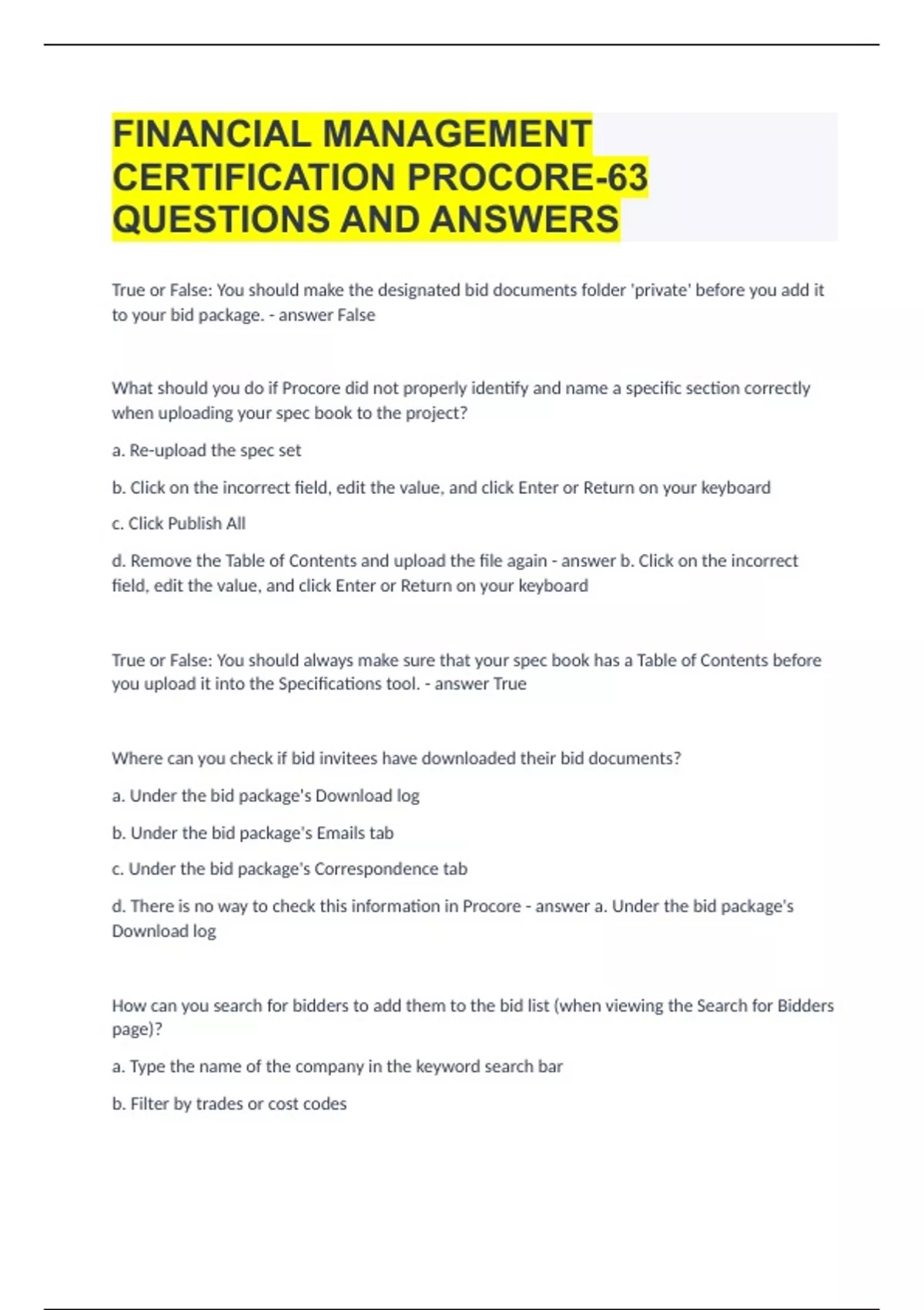 FINANCIAL MANAGEMENT CERTIFICATION PROCORE-63 QUESTIONS AND ANSWERS
