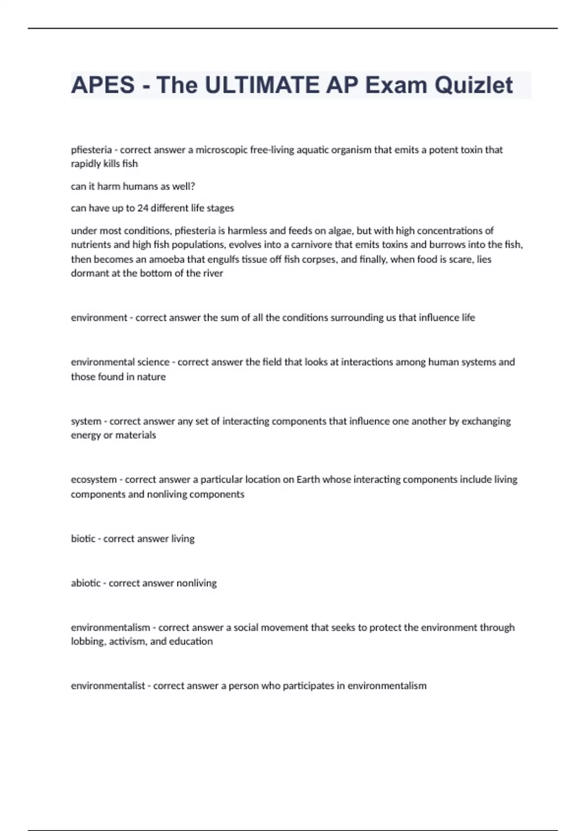 APES - The ULTIMATE AP Exam Quizlet Question and answers already passed 2023/2024 pfiesteria - correct answer a microscopic free-living aquatic organism that emits a potent toxin that rapidly kills fish can it harm humans as well? can have up to 24 different life stages under most conditions, pfiesteria is harmless and feeds on algae, but with high concentrations of nutrients and high fish populations, evolves into a carnivore that emits toxins and burrows into the fish, then becomes an amoeba that engulfs tissue off fish corpses, and finally, when food is scare, lies dormant at the bottom of the river environment - correct answer the sum of all the conditions surrounding us that influence life environmental science - correct answer the field that looks at interactions among human systems and those found in nature system - correct answer any set of interacting components that influence one another by exchanging energy or materials