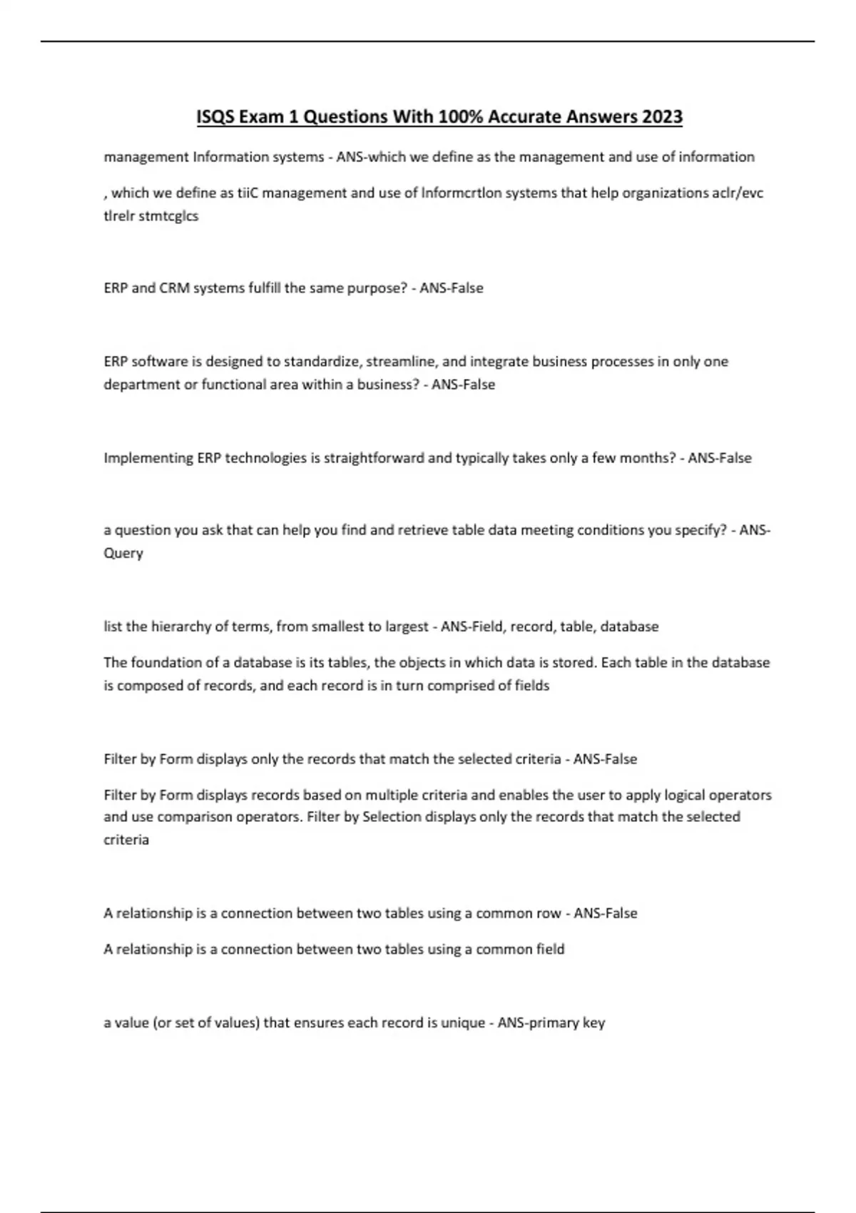 ISQS Exam 1 Questions With 100% Accurate Answers 2023 management Information systems - ANS-which we define as the management and use of information , which we define as tiiC management and use of lnformcrtlon systems that help organizations aclr/evc tlrelr stmtcglcs ERP and CRM systems fulfill the same purpose? - ANS-False ERP software is designed to standardize, streamline, and integrate business processes in only one department or functional area within a business? - ANS-False Implementing ERP technologies is straightforward and typically takes only a few months? - ANS-False a question you ask that can help you find and retrieve table data meeting conditions you specify? - ANSQuery list the hierarchy of terms, from smallest to largest - ANS-Field, record, table, database The foundation of a database is its tables, the objects in which data is stored. Each table in the database is composed of records, and each record is in turn comprised of fields Filter by Form displays only the records that match the selected criteria - ANS-False Filter by Form displays records based on multiple criteria and enables the user to apply logical operators and use comparison operators. Filter by Selection displays only the records that match the selected criteria A relationship is a connection between two tables using a common row - ANS-False A relationship is a connection between two tables using a common field a value (or set of values) that ensures each record is unique - ANS-primary key show a subset of data to analyze - ANS-Group Data A PivotTable in Excel is a powerful tool that lets you see what? - ANS-comparisons,trends,patterns calculate, summarize, and analyze data help you to attain job security? - ANS-Develop strong non-routine cognitive skills a native application that is designed to run on a particular operating system? - ANS-Thick-client application a computer that is designed to support processing requests from many remote computers and users? - ANS-Server the process by which one physical computer hosts many different virtual (not literal) computers within it? - ANS-Virtualization Metcalfe's Law? - ANS-The value of a network is equal to the square of the number of users connected to it V=U^2 Information Age - ANS-started In the 1970s, a period In history where the production. distribution. and control of Information Is the primary driver of the economy Digital Revolution - ANS-the conversion from mechanical and analog devices to digital devices shift to digital devices meant monumental changes for companies. Individuals. and our society as a whole share data work faster as processor speed Increased Gordon Bell - ANS-1972. computer scientist recognized that these digital devices would change the world as they evolved and became widely used Bells Law. which states that "a new computer class forms roughly each decade establishing a new industry." digital devices will evolve so quickly that they will enable new platforms, programming environments. Industries, networks, and Information systems every 10 years Changes every 10 years - ANS-1980- CONTINUES...