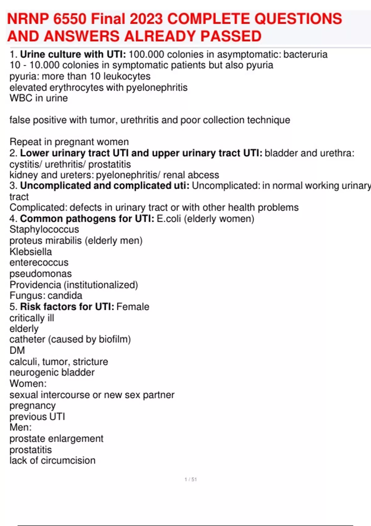 1. Urine culture with UTI: 100.000 colonies in asymptomatic: bacteruria 10 - 10.000 colonies in symptomatic patients but also pyuria pyuria: more than 10 leukocytes elevated erythrocytes with pyelonephritis WBC in urine false positive with tumor, urethritis and poor collection technique Repeat in pregnant women 2. Lower urinary tract UTI and upper urinary tract UTI: bladder and urethra: cystitis/ urethritis/ prostatitis kidney and ureters: pyelonephritis/ renal abcess 3. Uncomplicated and complicated uti: Uncomplicated: in normal working urinary tract Complicated: defects in urinary tract or with other health problems 4. Common pathogens for UTI: E.coli (elderly women) Staphylococcus proteus mirabilis (elderly men) Klebsiella enterecoccus pseudomonas Providencia (institutionalized) Fungus: candida 5. Risk factors for UTI: Female critically ill elderly catheter (caused by biofilm) DM calculi, tumor, stricture neurogenic bladder Women: sexual intercourse or new sex partner pregnancy previous UTI Men: prostate enlargement prostatitis lack of circumcision