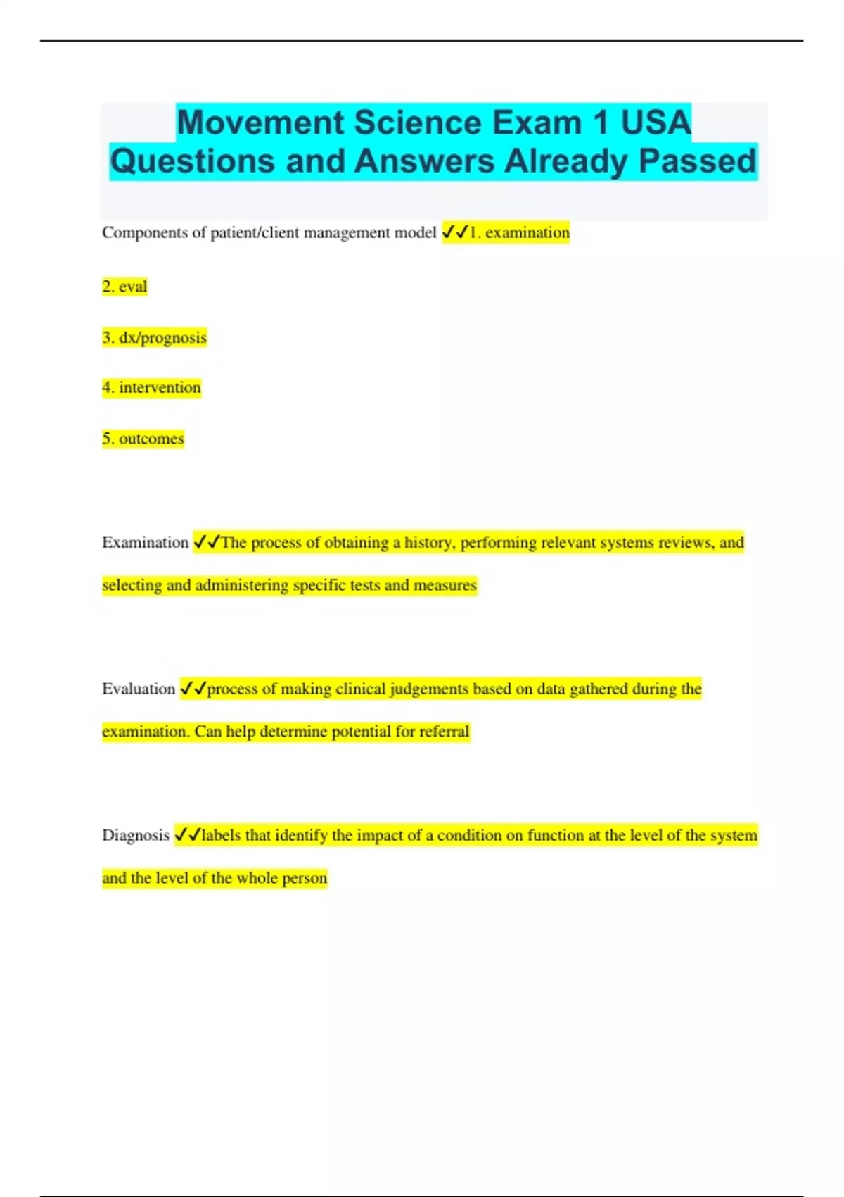 Movement Science Exam 1 USA Questions and Answers Already Passed Components of patient/client management model 1. examination 2. eval 3. dx/prognosis 4. intervention 5. outcomes Examination The process of obtaining a history, performing relevant systems reviews, and selecting and administering specific tests and measures Evaluation process of making clinical judgements based on data gathered during the examination. Can help determine potential for referral Diagnosis labels that identify the impact of a condition on function at the level of the system and the level of the whole person Prognosis predicted optimal level of improvement in function and amount of time needed to reach that level intervention purposeful and skilled interaction of the therapist with the patient Outcomes actual results of implementing the plan of care that indicate the impact on functioning ICF Model World Health organizations framework that provides conceptual framework for examinig effect of a health condition Impairment (ICF model) significant deviation or loss in body function or structure Activity limitations (ICF model) difficulties an individual may have in executing activities participation restriction problems an individual may experience in involvement in life situations environmental factors external to the individual that facilitate or hinder impact of features of the physical, social, and attitudinal world Personal Factors age and life-cycle stage, occupation, economic situation, lifestyle, personality and self-concept Task oriented approach to examination Evaluation of Functional Activities; Description of strategies used to complete functional skills; Quantification of the underlying sensory, motor and cognitive impairments that constrain performance of functional activities task analysis a detailed observational analysis of the patients total body movement patterns during task performance Task Analysis Steps 1. initial conditions 2. preparation 3. initiation 4. execution 5. termination Motor Control Theory group of abstract ideas about the control of movement Reflex Theory Charles Sherrington (late 1800s