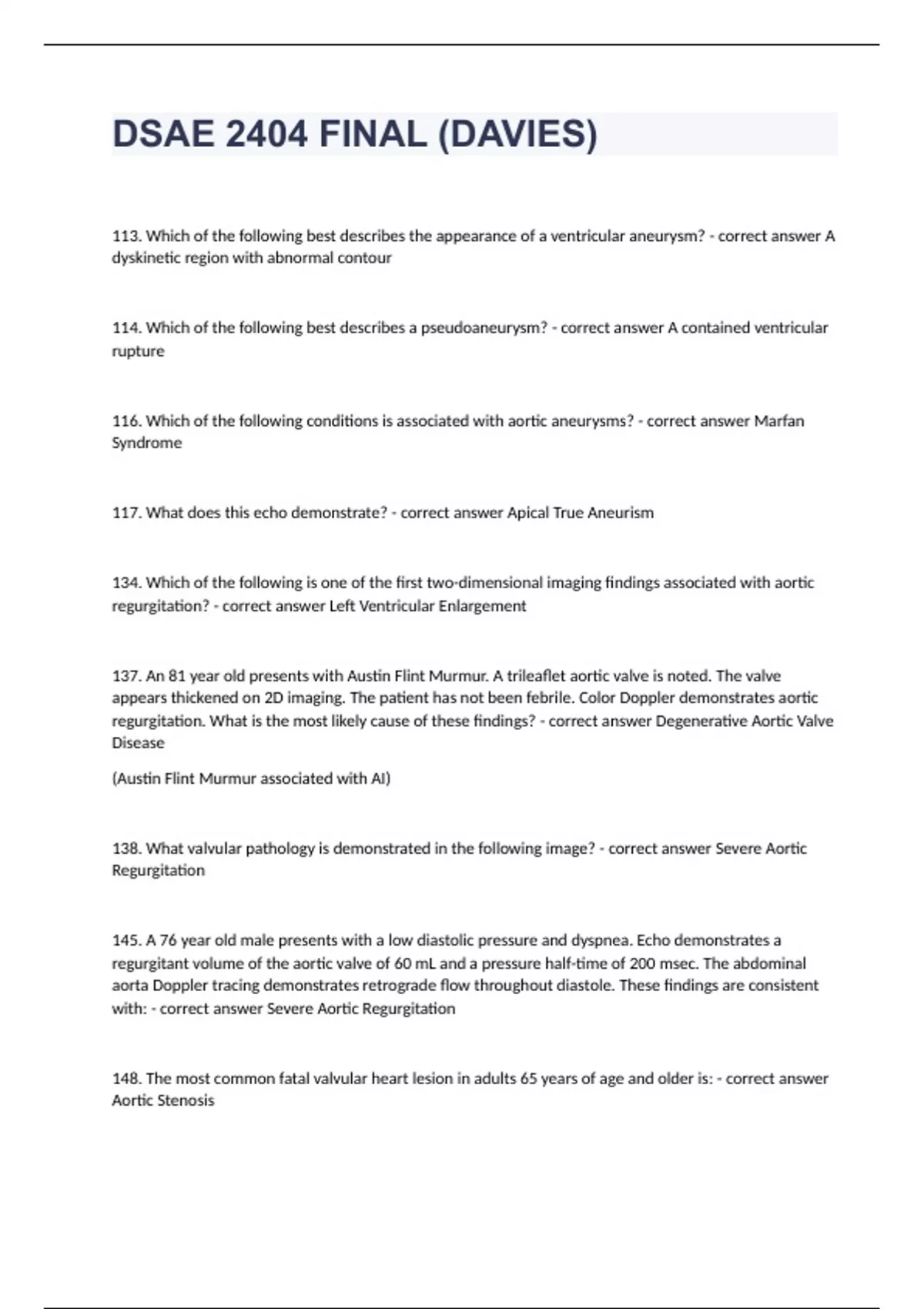 DSAE 2404 FINAL (DAVIES) Question and answers 2023/2024 verified to pass113. Which of the following best describes the appearance of a ventricular aneurysm? - correct answer A dyskinetic region with abnormal contour 114. Which of the following best describes a pseudoaneurysm? - correct answer A contained ventricular rupture 116. Which of the following conditions is associated with aortic aneurysms? - correct answer Marfan Syndrome