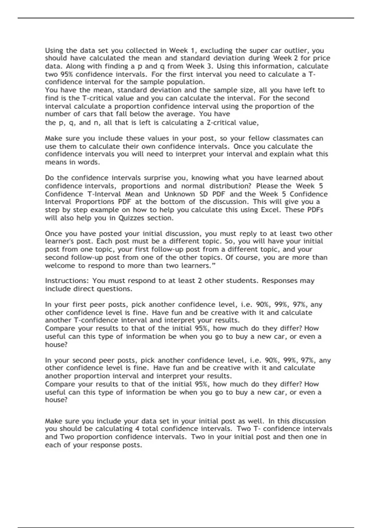 Using the data set you collected in Week 1, excluding the super car outlier, you should have calculated the mean and standard deviation during Week 2 for price data. Along with finding a p and q from Week 3. Using this information, calculate two 95% confidence intervals. For the first interval you need to calculate a T-confidence interval for the sample population. You have the mean, standard deviation and the sample size, all you have left to find is the T-critical value and you can calculate the interval. For the second interval calculate a proportion confidence interval using the proportion of the number of cars that fall below the average. You have the p, q, and n, all that is left is calculating a Z-critical value,