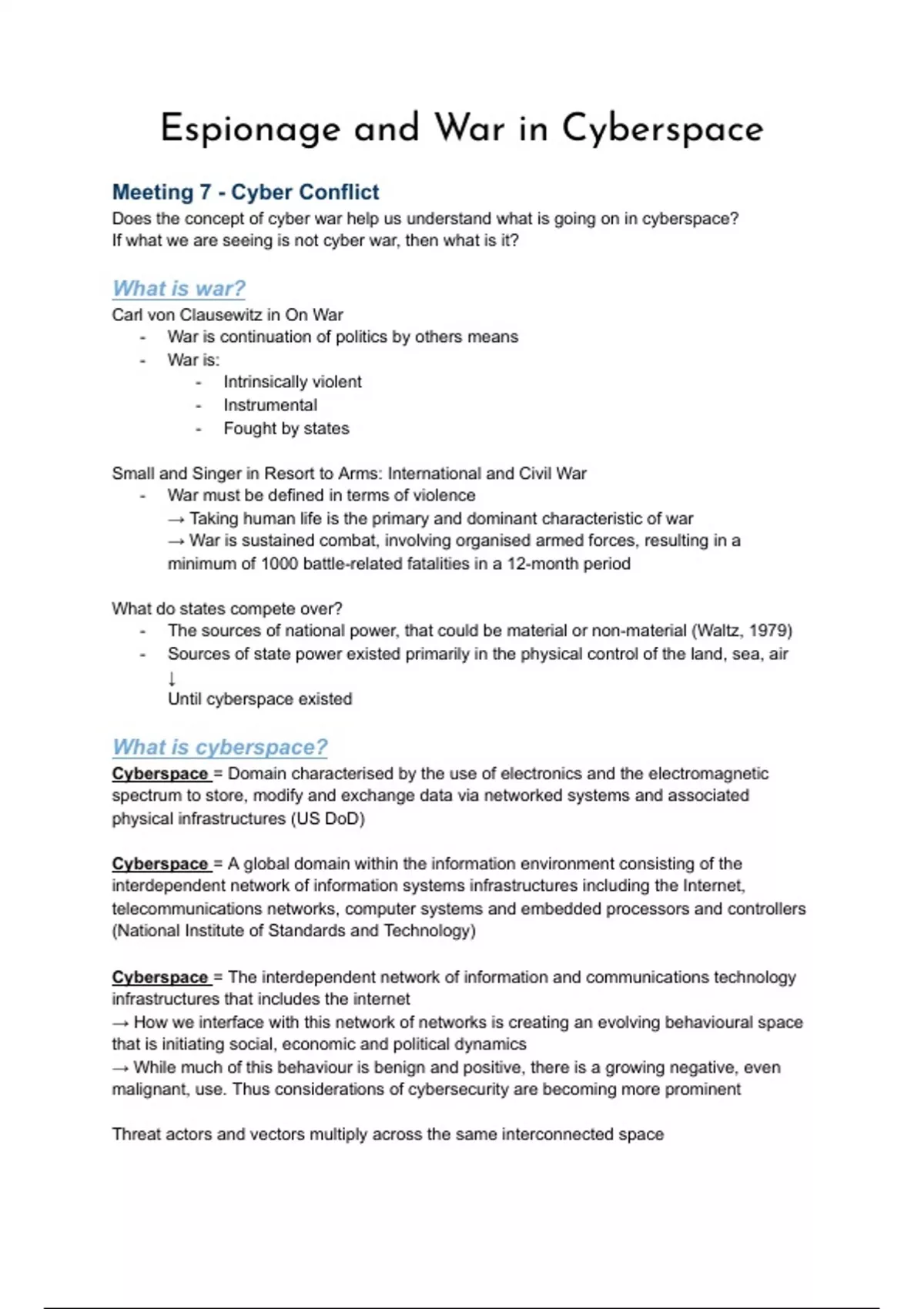Cyber war = War conducted in and from computers and the networks connecting them,
