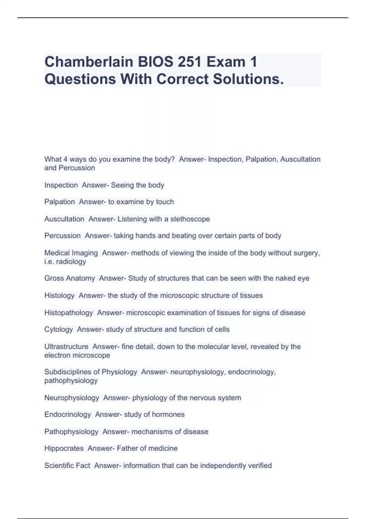 Chamberlain BIOS 251 Exam 1 Questions With Correct Solutions.