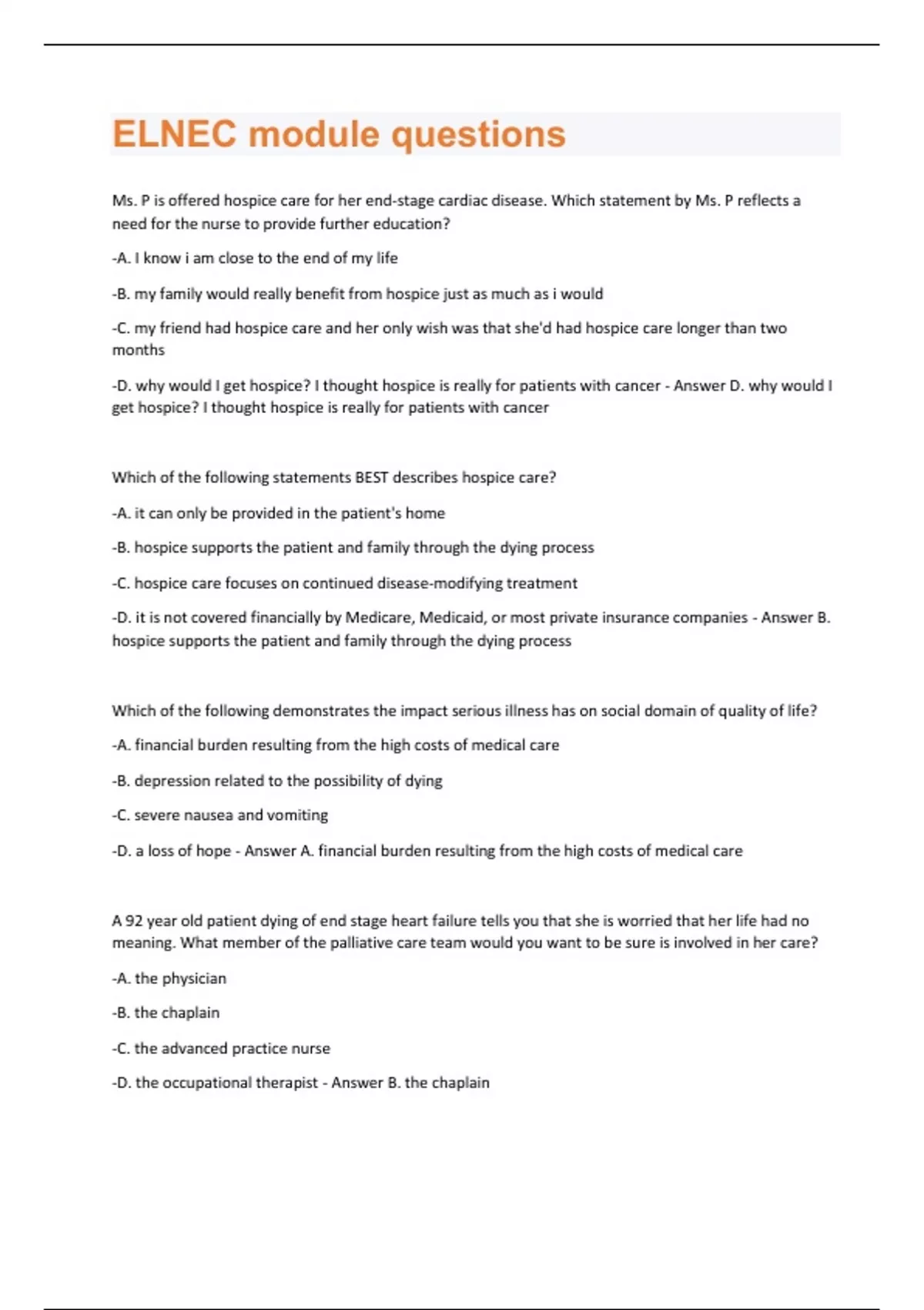 Ms. P is offered hospice care for her end-stage cardiac disease. Which statement by Ms. P reflects a need for the nurse to provide further education? -A. I know i am close to the end of my life -B. my family would really benefit from hospice just as much as i would -C. my friend had hospice care and her only wish was that she'd had hospice care longer than two months -D. why would I get hospice? I thought hospice is really for patients with cancer - Answer D. why would I get hospice? I thought hospice is really for patients with cancer Which of the following statements BEST describes hospice care? -A. it can only be provided in the patient's home -B. hospice supports the patient and family through the dying process -C. hospice care focuses on continued disease-modifying treatment -D. it is not covered financially by Medicare, Medicaid, or most private insurance companies - Answer B. hospice supports the patient and family through the dying process Which of the following demonstrates the impact serious illness has on social domain of quality of life? -A. financial burden resulting from the high costs of medical care -B. depression related to the possibility of dying -C. severe nausea and vomiting -D. a loss of hope - Answer A. financial burden resulting from the high costs of medical care A 92 year old patient dying of end stage heart failure tells you that she is worried that her life had no meaning. What member of the palliative care team would you want to be sure is involved in her care? -A. the physician -B. the chaplain -C. the advanced practice nurse -D. the occupational therapist - Answer B. the chaplainMrs. Smith is suffering with severe bone pain from metastatic cancer. Which domain of quality of life is this affecting? -A. physical -B. psychological -C. social -D. spiritual - Answer A. physical