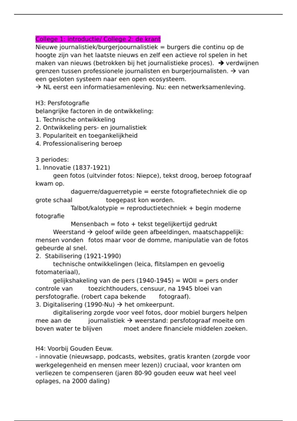 Inleiding in de journalistiek samenvatting colleges en literatuur