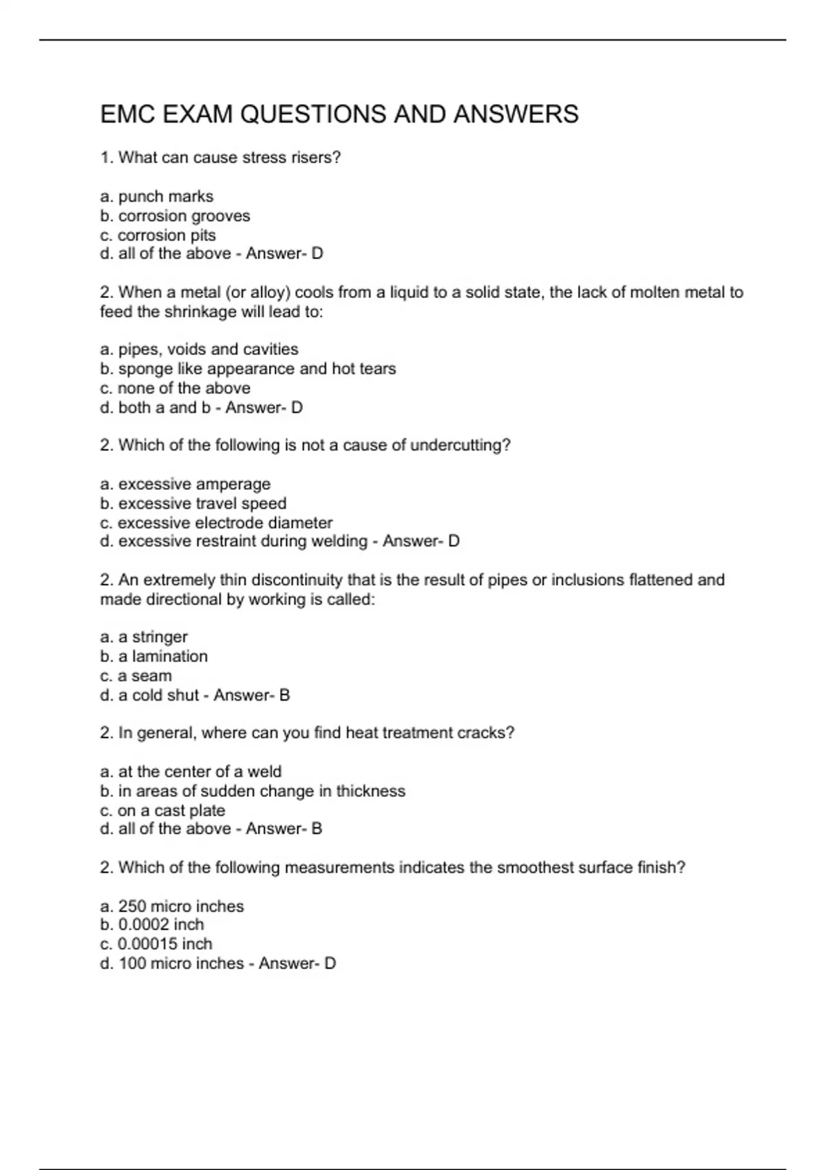 1. What can cause stress risers? a. punch marks b. corrosion grooves c. corrosion pits d. all of the above - Answer- D 2. When a metal (or alloy) cools from a liquid to a solid state, the lack of molten metal to feed the shrinkage will lead to: a. pipes, voids and cavities b. sponge like appearance and hot tears c. none of the above d. both a and b - Answer- D 2. Which of the following is not a cause of undercutting? a. excessive amperage b. excessive travel speed c. excessive electrode diameter d. excessive restraint during welding - Answer- D 2. An extremely thin discontinuity that is the result of pipes or inclusions flattened and made directional by working is called: a. a stringer b. a lamination c. a seam d. a cold shut - Answer- B 2. In general, where can you find heat treatment cracks? a. at the center of a weld b. in areas of sudden change in thickness c. on a cast plate d. all of the above - Answer- B 2. Which of the following measurements indicates the smoothest surface finish? a. 250 micro inches b. 0.0002 inch c. 0.00015 inch d. 100 micro inches - Answer- D