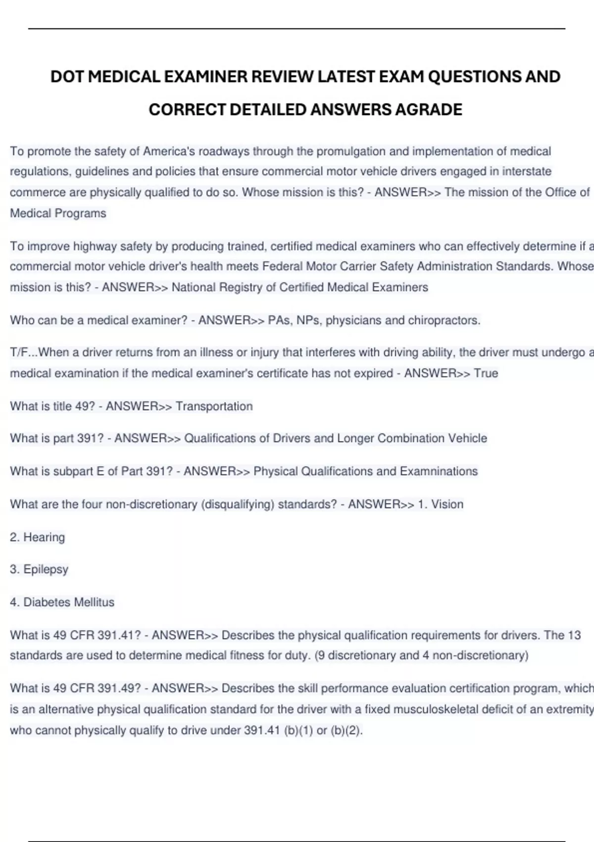 DOT MEDICAL EXAMINER REVIEW LATEST EXAM QUESTIONS AND CORRECT DETAILED ANSWERS