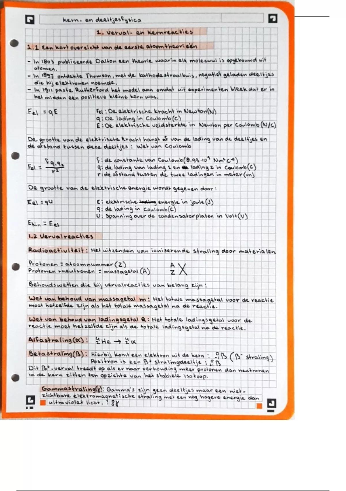 Samenvatting van de keuzemodule kern- en deeltjesfysica. Op de middelbare school moet je op het vwo twee van de vier keuzemodules afsluiten. Een keuzemodule hiervan is kern- en deeltjesfysica. In deze samenvatting vind je onder andere een kort overzicht van de eerste atoomtheorieën. Daarna een uitleg over vervalreacties. Verschillende soorten straling komen aanbod. Verschillende behoudswetten worden beschreven met hun eventueel bijbehorende formules. En nog veel meer!