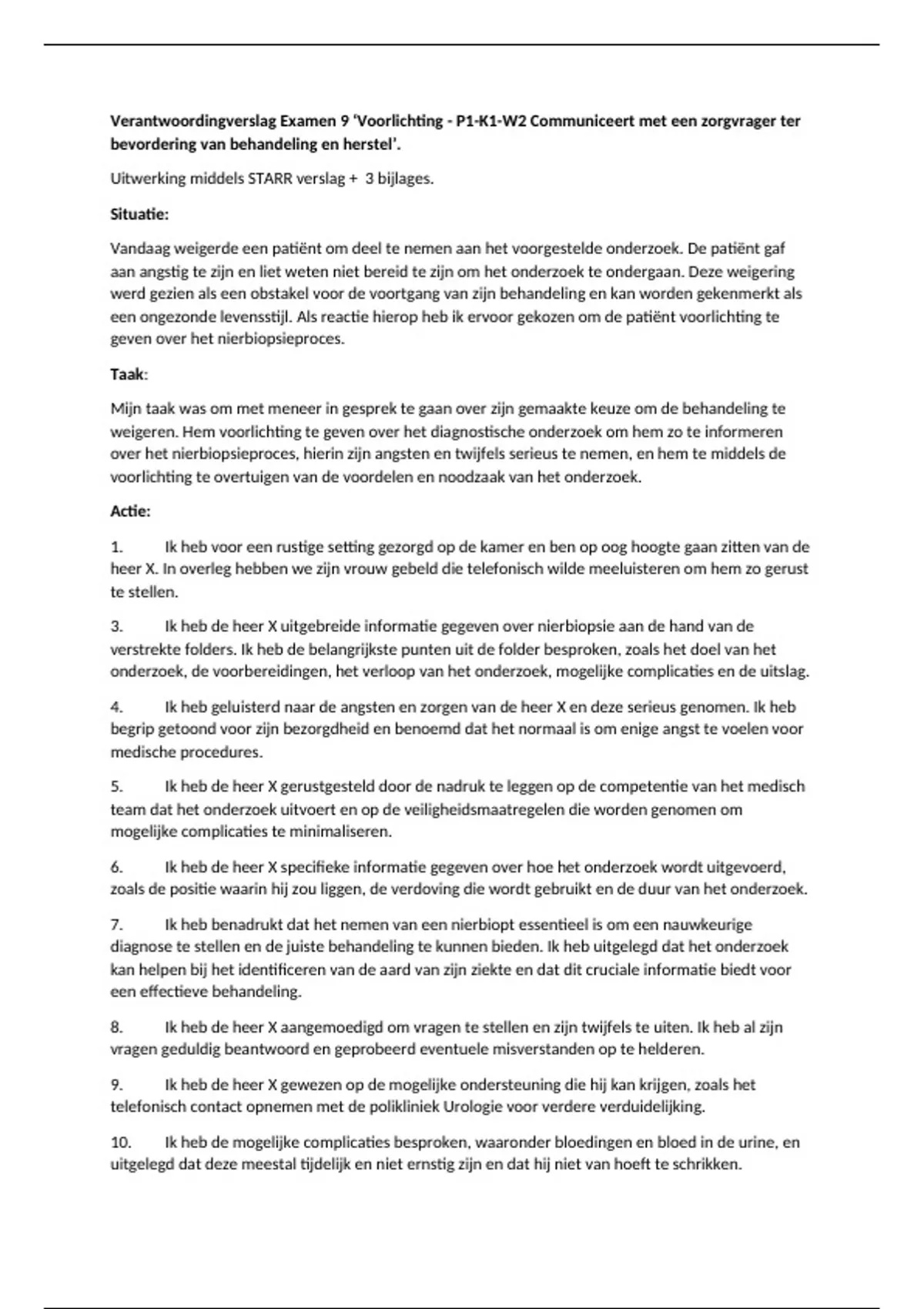Verantwoordingverslag Examen 9 ‘Voorlichting - P1-K1-W2 Communiceert met een zorgvrager ter