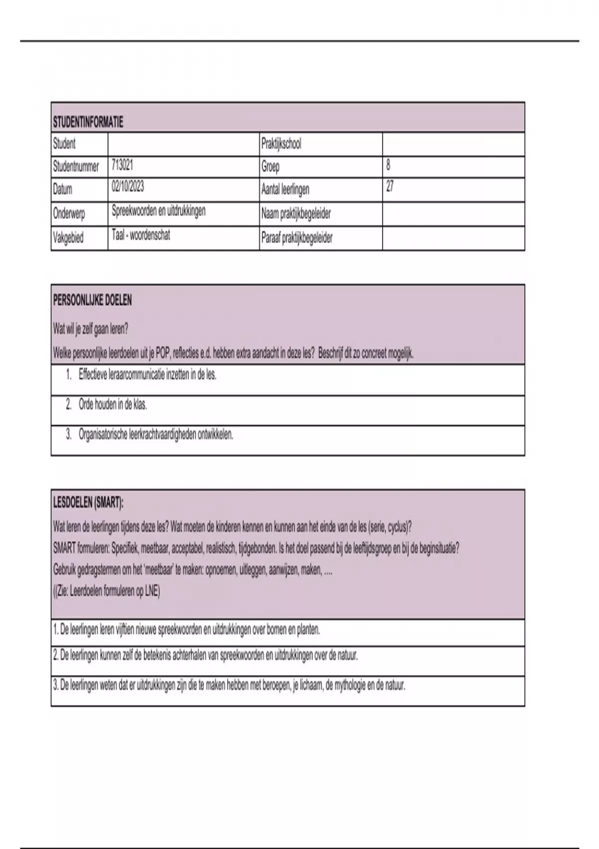Lesvoorbereidingsformulier taal groep 8 PABO