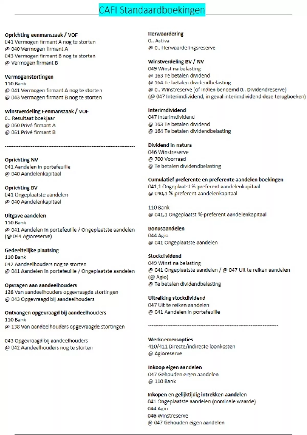Dit is een samenvatting van alle belangrijke boekingen, die moeten worden gemaakt voor het vak Comptabele Aspecten Financiering (CAFI) van de Bachelor of Science in Accountancy op Nyenrode Business Universiteit Breukelen. Ik heb zelf met deze samenvatting het tentamen in één keer gehaald en het heeft mij erg geholpen. Dit kant en klare overzicht bespaard je waarschijnlijk vooral tijd en is het enige wat ik echt nodig heb gehad.