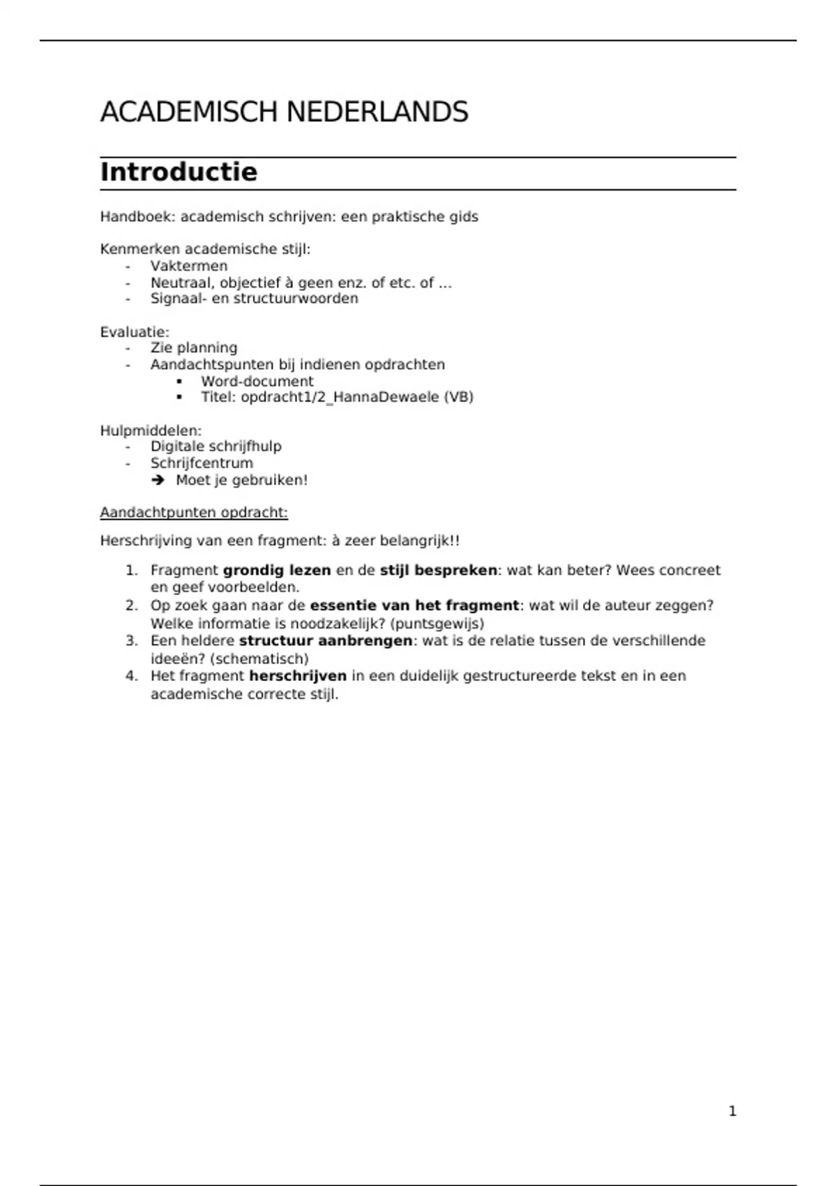 Dit is een samenvatting van het vak Academisch Nederlands. Het bevat alle inhoud uit de lessen (slides) en mijn eigen notities. De lessen zijn gebaseerd op het boek 'Academisch schrijven'. Geslaagd - eerste zit