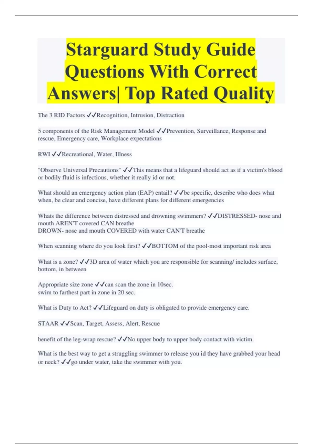 Starguard Study Guide Questions With Correct Answers| Top Rated Quality The 3 RID Factors Recognition, Intrusion, Distraction 5 components of the Risk Management Model Prevention, Surveillance, Response and rescue, Emergency care, Workplace expectations RWI Recreational, Water, Illness "Observe Universal Precautions" This means that a lifeguard should act as if a victim's blood or bodily fluid is infectious, whether it really id or not. What should an emergency action plan (EAP) entail? be specific, describe who does what when, be clear and concise, have different plans for different emergencies Whats the difference between distressed and drowning swimmers? DISTRESSED- nose and mouth AREN'T covered CAN breathe DROWN- nose and mouth COVERED with water CAN'T breathe When scanning where do you look first? BOTTOM of the pool-most important risk area What is a zone? 3D area of water which you are responsible for scanning/ includes surface, bottom, in between