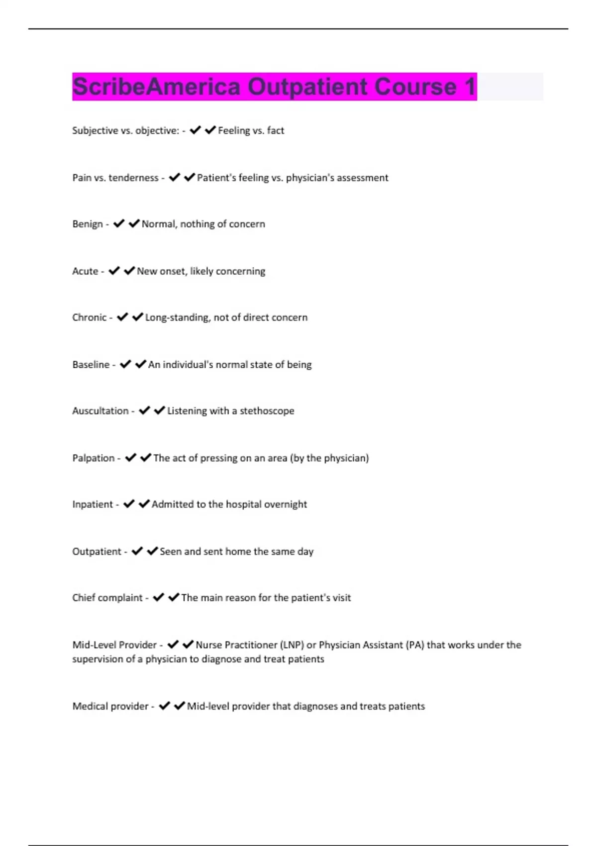 Subjective vs. objective: - Feeling vs. fact Pain vs. tenderness - Patient's feeling vs. physician's assessment Benign - Normal, nothing of concern Acute - New onset, likely concerning Chronic - Long-standing, not of direct concern Baseline - An individual's normal state of being Auscultation - Listening with a stethoscope Palpation - The act of pressing on an area (by the physician) Inpatient - Admitted to the hospital overnight Outpatient - Seen and sent home the same day Chief complaint - The main reason for the patient's visit Mid-Level Provider - Nurse Practitioner (LNP) or Physician Assistant (PA) that works under the supervision of a physician to diagnose and treat patients Medical provider - Mid-level provider that diagnoses and treats patientsNurse or Medical Assistant - Records medical histories and symptoms, monitors the patient, completes the meaningful use requirements, administers medications, assists with procedures Clinical provider - Includes both the mid-level provider and nurse or medical assistant that are direct patient care Scribe - Documents the patient's visit on behalf of the physician Clerical - Receptionist and scribe that there is no patient care and only documentation Scribes CAN.... - -Document the history, physical exam, results, procedures, assessment, and plan -Access and document laboratory results and radiology findings -Locate and obtain PMHx, previous charts, past results, and recent studies -Record physician interpretations of x-rays and EKGs Assessment vs Plan - Diagnosis vs Treatment Scribes CANNOT... - -Partake in any activity that may affect patient health or outcome -Touch patients -Handle bodily fluids or specimens -Sign or authenticate any chart or record -Give verbal orders or submit electronic orders -NO direct patient care, No patient samples, No using logins other than your own NEW Patient - No previous records, Longer visit, and Detailed chart ESTABLISHED Patient - Previous records available, Shorter visit, and Concise chartDiagnostic Visit - New problem, Chief complaint: new symptom, goal is to determine the cause of the problem and appropriate treatment Health Management Visit - Check-up, Chief Complaint: Routine physical or management of chronic problem(s), and Goal is preventative care and/or assessing progress of ongoing medical problems CLINIC FLOW - Check in -> Physical evaluation -> Orders & Results -> Assessment & Plan -> Check Out CLINIC FLOW - CHECK-IN - Patient Walks in (Diagnostic vs. Health Management) -> Room Placement -> Meaningful Use obtained by Nurse/MA (Chief complaint, Vital signs: HR, BP, T, RR), Height, Weight, BMI, Smoking Status) -> Nurse/MA Assessment (Confirm chief complaints, review allergies/medications , brief past medical history)
