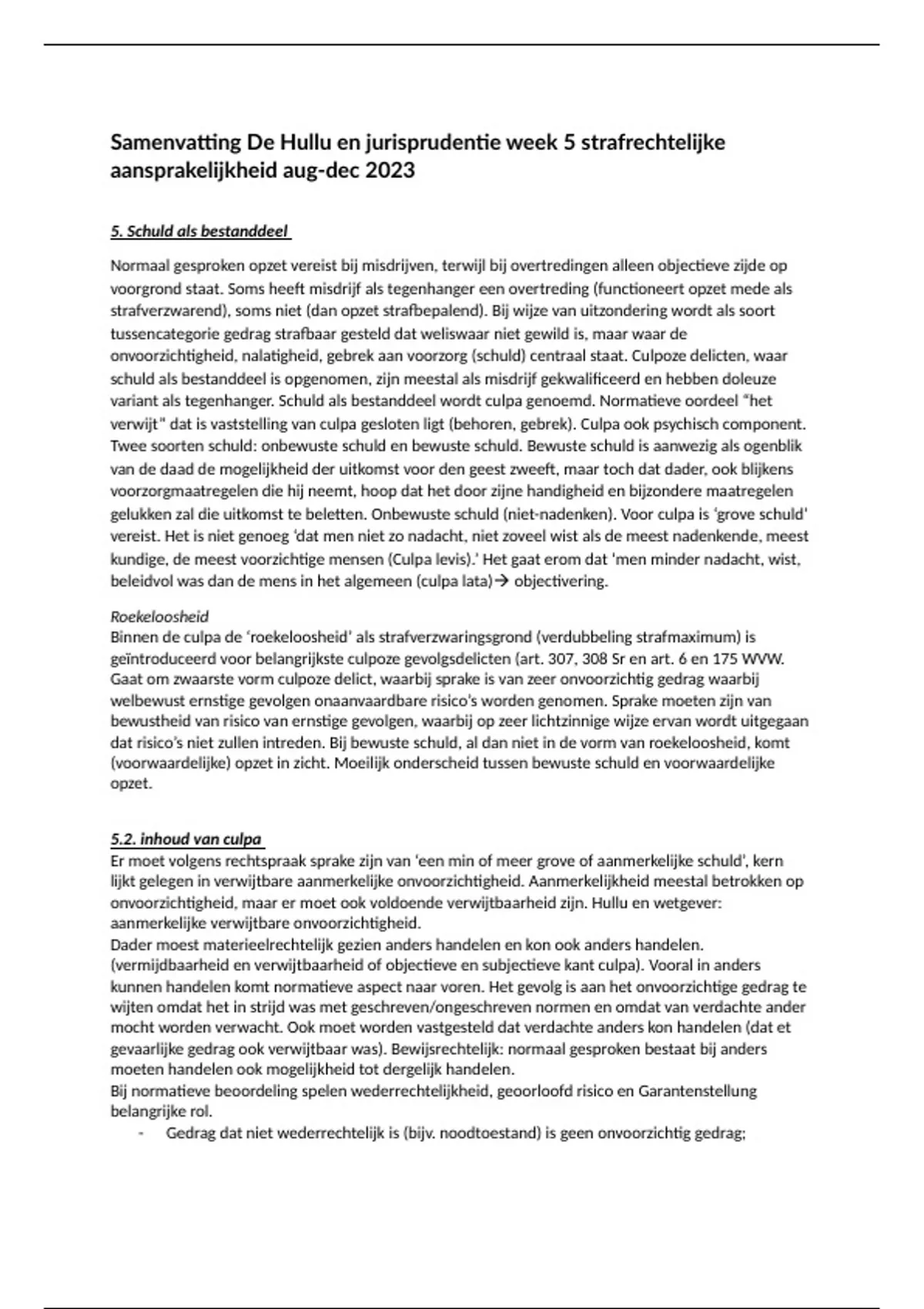 Samenvatting De Hullu en jurisprudentie week 5 strafrechtelijke