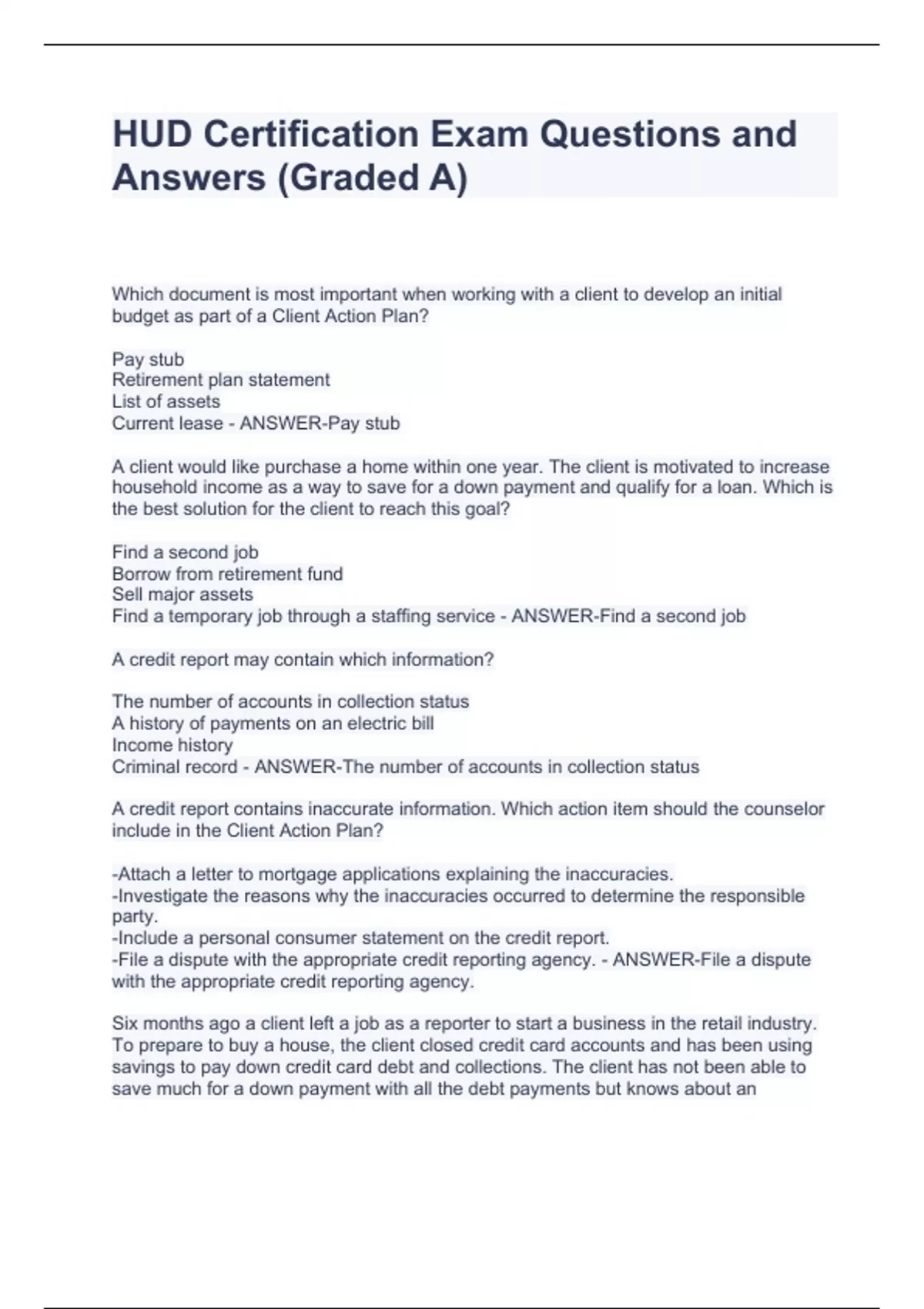 HUD Certification Exam Questions and Answers (Graded A) HUD Certification Exam Questions and Answers (Graded A) HUD Certification Exam Questions and Answers (Graded A) HUD Certification Exam Questions and Answers (Graded A) Which document is most important when working with a client to develop an initial budget as part of a Client Action Plan? Pay stub Retirement plan statement List of assets Current lease - ANSWER-Pay stub A client would like purchase a home within one year. The client is motivated to increase household income as a way to save for a down payment and qualify for a loan. Which is the best solution for the client to reach this goal? Find a second job Borrow from retirement fund Sell major assets Find a temporary job through a staffing service - ANSWER-Find a second job A credit report may contain which information?