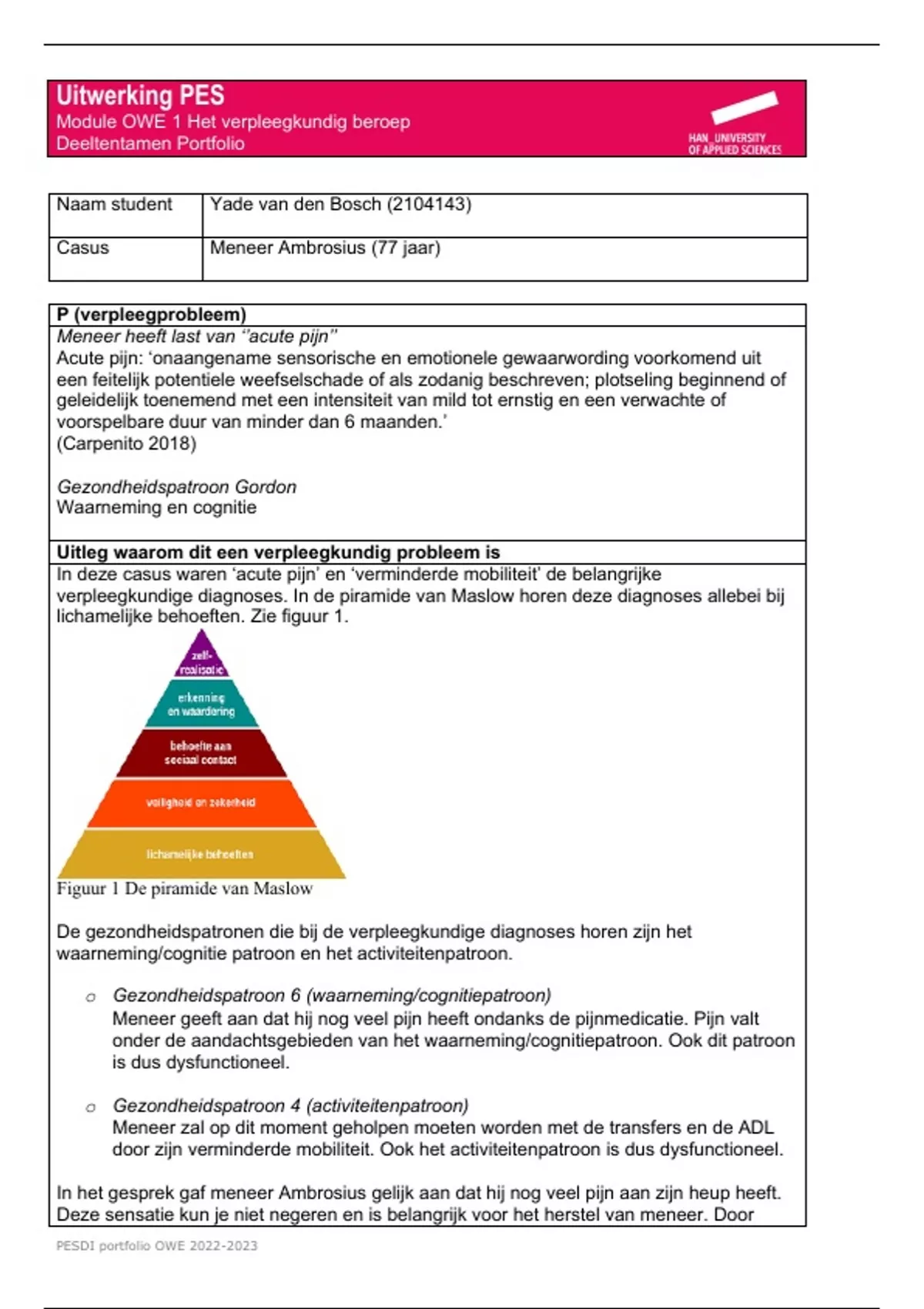 verpleegkundige diagnoses. In de piramide van Maslow horen deze diagnoses allebei bij