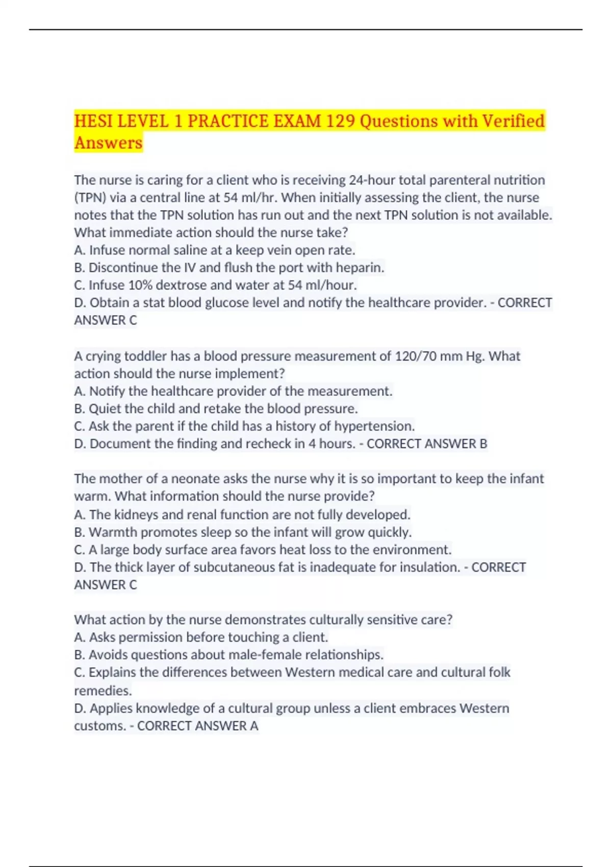 HESI LEVEL 1 PRACTICE EXAM 129 Questions with Verified Answers The nurse is caring for a client who is receiving 24-hour total parenteral nutrition (TPN) via a central line at 54 ml/hr. When initially assessing the client, the nurse notes that the TPN solution has run out and the next TPN solution is not available. What immediate action should the nurse take? A. Infuse normal saline at a keep vein open rate. B. Discontinue the IV and flush the port with heparin. C. Infuse 10% dextrose and water at 54 ml/hour. D. Obtain a stat blood glucose level and notify the healthcare provider. - CORRECT ANSWER C A crying toddler has a blood pressure measurement of 120/70 mm Hg. What action should the nurse implement? A. Notify the healthcare provider of the measurement. B. Quiet the child and retake the blood pressure. C. Ask the parent if the child has a history of hypertension. D. Document the finding and recheck in 4 hours. - CORRECT ANSWER B The mother of a neonate asks the nurse why it is so important to keep the infant warm. What information should the nurse provide? A. The kidneys and renal function are not fully developed. B. Warmth promotes sleep so the infant will grow quickly. C. A large body surface area favors heat loss to the environment. D. The thick layer of subcutaneous fat is inadequate for insulation. - CORRECT ANSWER C What action by the nurse demonstrates culturally sensitive care? A. Asks permission before touching a client. B. Avoids questions about male-female relationships. C. Explains the differences between Western medical care and cultural folk remedies. D. Applies knowledge of a cultural group unless a client embraces Western customs. - CORRECT ANSWER A A client has a nursing diagnosis of, "Spiritual distress related to a loss of hope, secondary to impending death." What intervention is best for the nurse to implement when caring for this client? A. Help the client to accept the final stage of life. B. Assist and support the client in establishing short-term goals. C. Encourage the client to make future plans, even if they are unrealistic. D. Instruct the client's family to focus on positive aspects of the client's life. - CORRECT ANSWER B A client who is 5 foot 5 inches tall and weighs 200 pounds is scheduled for surgery the next day. Which question is most important for the nurse to include during the preoperative assessment? A. "What is your daily calorie consumption?" B. "What vitamin and mineral supplements do you take?" C. "Do you feel that you are overweight?" D. "Will a clear liquid diet be okay after surgery?" - CORRECT ANSWER B The nurse working in the emergency department is assessing four clients' ability to tolerate pain. Which client is likely to tolerate a higher level of pain? A. A 10-year-old who was burned by a camp fire earlier today. B. A 70-year-old who has a postoperative infection from a surgery one week ago. C. A 23-year-old woman who sprained her knee while bicycling. D. A 55-year-old woman who has had moderate low back pain for three months. - CORRECT ANSWER D A hospitalized male client is receiving nasogastric tube feedings via a small-bore tube and a continuous pump infusion. He reports that he had a bad bout of severe coughing a few minutes ago, but feels fine now. What action is best for the nurse to take? A. Record the coughing incident. No further action is required at this time. B. Stop the feeding, explain to the family why it is being stopped, and notify the healthcare provider. C. After clearing the tube with 30 ml of air, check the pH of fluid withdrawn from the tube. D. Inject 30 ml of air into the tube while auscultating the epigastrium for gurgling. - CORRECT ANSWER C In evaluating client care, which action should the nurse take first? A. Determine if the expected outcomes of care were achieved. B. Review the rationales used as the basis of nursing actions. C. Document the care plan goals that were successfully met. D. Prioritize interventions to be added to the client's plan of care. - CORRECT ANSWER A A female client asks the nurse to find someone who can translate her treatment concerns into her native language. Which action should the nurse take? A. Explain that anyone who speaks her language can answer her questions. B. Provide a translator only in an emergency situation. C. Ask a family member or friend of the client to translate. D. Request and document the name of the certified translator. - CORRECT ANSWER D An unlicensed assistive personnel (UAP) places a client in a left lateral position prior to administering a soap suds enema. Which instruction should the nurse provide the UAP? A. Position the client on the right side of the bed in reverse Trendelenburg. B. Fill the enema container with 1000 mL of warm water and 5 mL of castile soap. C. Reposition in a Sims' position with the client's weight on the anterior ilium. D. Raise the side rails on both sides of the bed and elevate the bed to waist level. - CORRECT ANSWER C A child with a penetrating eye injury comes to the school clinic. What action should the nurse implement? A. Remove the object impaled in the eye and then apply a regular eye patch. B. Place an ice bag over the eye until the healthcare provider is seen. C. Irrigate the affected eye copiously with a cool sterile saline solution. D. Apply a Fox shield to the affected eye and any type of patch to the other eye. - CORRECT ANSWER D When making the bed of a client who needs a bed cradle, which action should the nurse include? A. Teach the client to call for help before getting out of bed. B. Keep both the upper and lower side rails in a raised position. C. Keep the bed in the lowest position while changing the sheets. D. Drape the top sheet and covers loosely over the bed cradle. - CORRECT ANSWER D A male client with venous incompetence stands up and his blood pressure subsequently drops. Which finding should the nurse identify as a compensatory response? A. Bradycardia. B. Increase in pulse rate. C. Peripheral vas