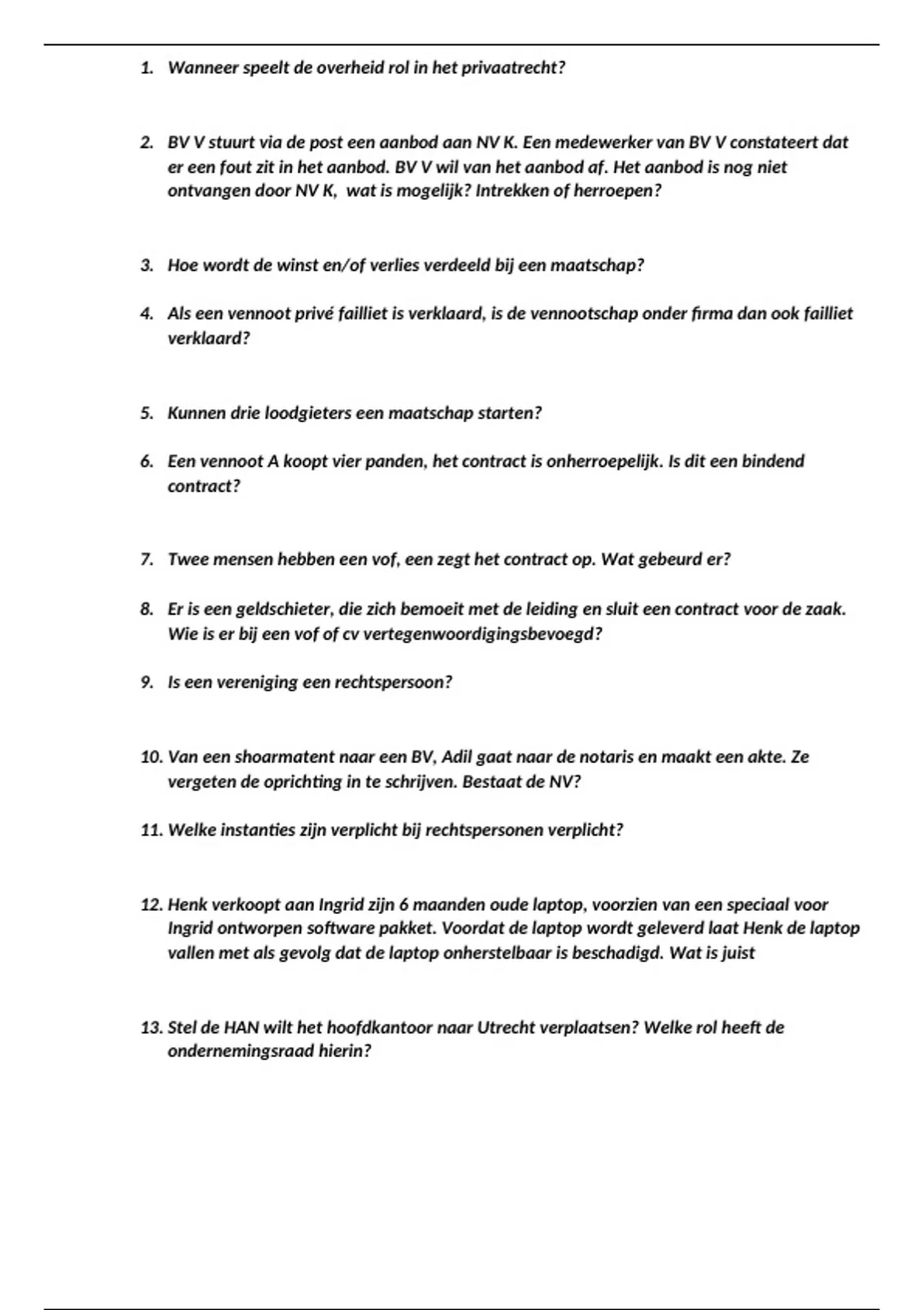 Dit document bevat een paar oefenvragen met uitgebreide antwoorden. Het zijn dertien openvragen die je de stof laten toepassen. Enkele vragen zijn ook tijdens colleges behandeld, dus heel toepasselijk voor tentamenvoorbereiding!
