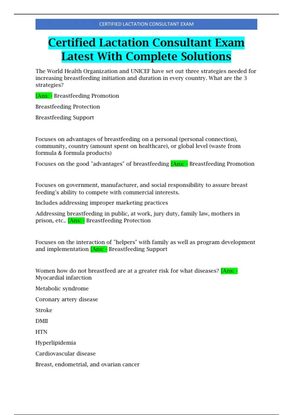 Certified Lactation Consultant Exam Latest With Complete Solutions Focuses on the interaction of "helpers" with family as well as program development and implementation {Ans: - Breastfeeding Support Women how do not breastfeed are at a greater risk for what diseases? {Ans: - Myocardial infarction Metabolic syndrome Coronary artery disease Stroke DMII HTN Hyperlipidemia Cardiovascular disease Breast, endometrial, and ovarian cancer Reason #1 why women do not exclusively breastfeed {Ans: - Unrealistic expectations from society about motherhood. Along with lack of preparation for what the newborn period would be like.
