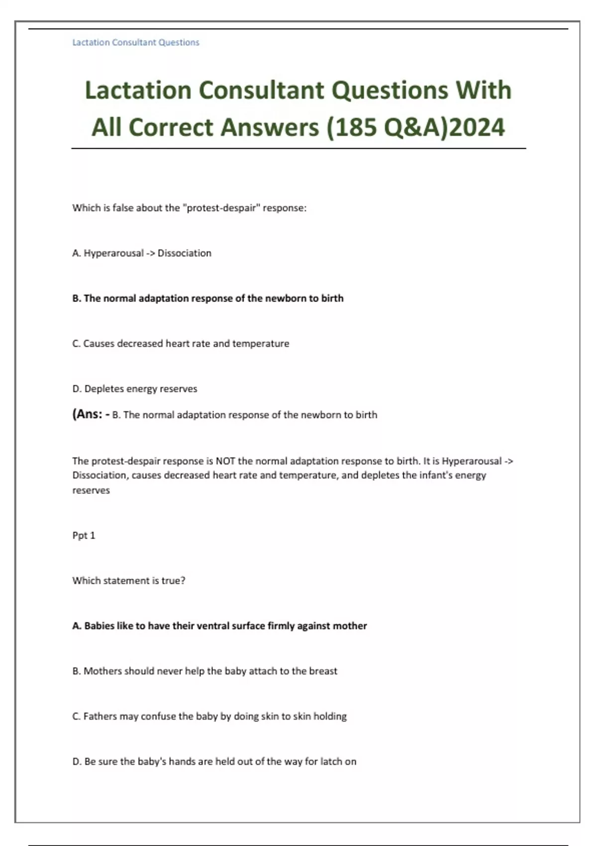 Lactation Consultant Questions With All Correct Answers (185 Q&A)2024 Which is false about the "protest-despair" response: A. Hyperarousal -> Dissociation B. The normal adaptation response of the newborn to birth C. Causes decreased heart rate and temperature D. Depletes energy reserves (Ans: - B. The normal adaptation response of the newborn to birth The protest-despair response is NOT the normal adaptation response to birth. It is Hyperarousal -> Dissociation, causes decreased heart rate and temperature, and depletes the infant's energy reserves Ppt 1 Which statement is true? A. Babies like to have their ventral surface firmly against mother B. Mothers should never help the baby attach to the breast C. Fathers may confuse the baby by doing skin to skin holding D. Be sure the baby's hands are held out of the way for latch on (Ans: - A. Babies like to have their ventral surface firmly against mother ppt 1