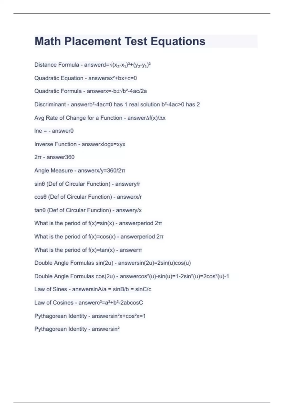 Math Placement Test Equations.