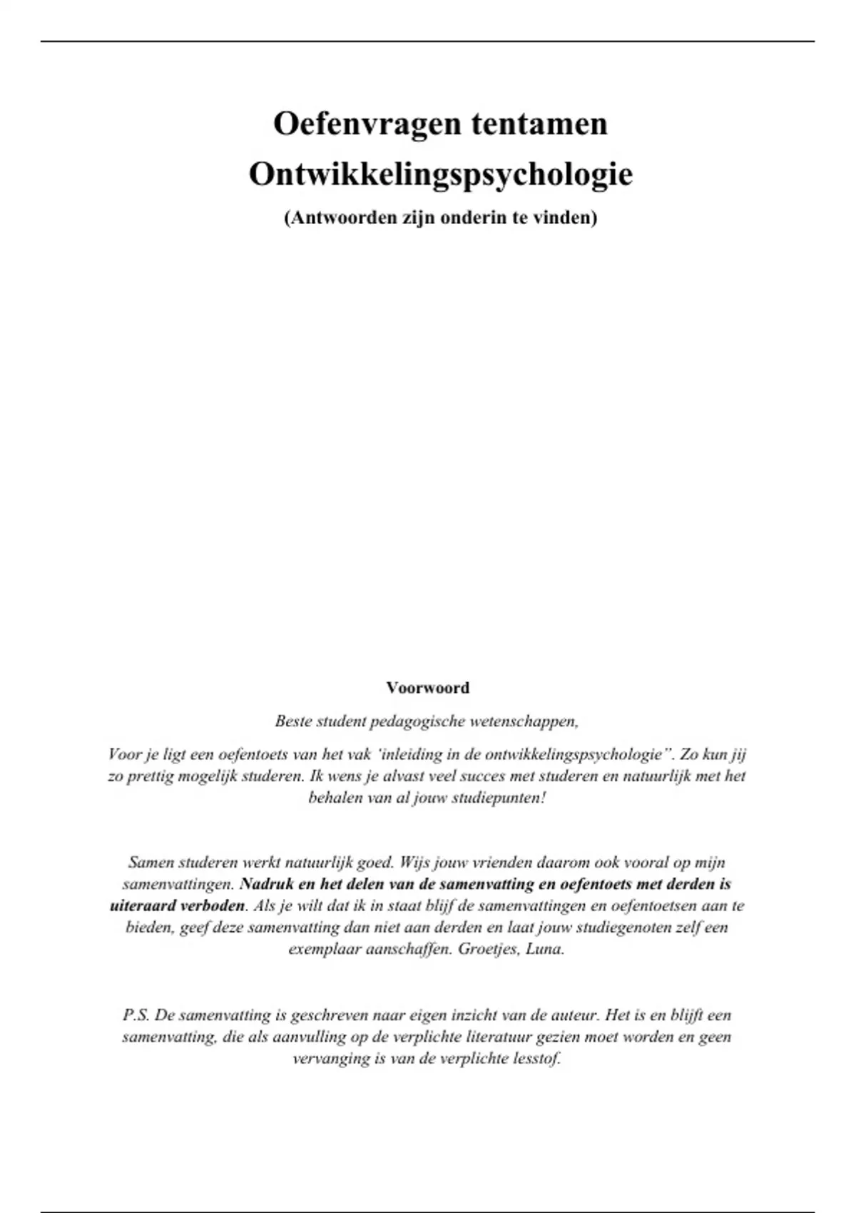 Voor je ligt een oefentoets van het vak ‘inleiding in de ontwikkelingspsychologie”. Zo kun jij
