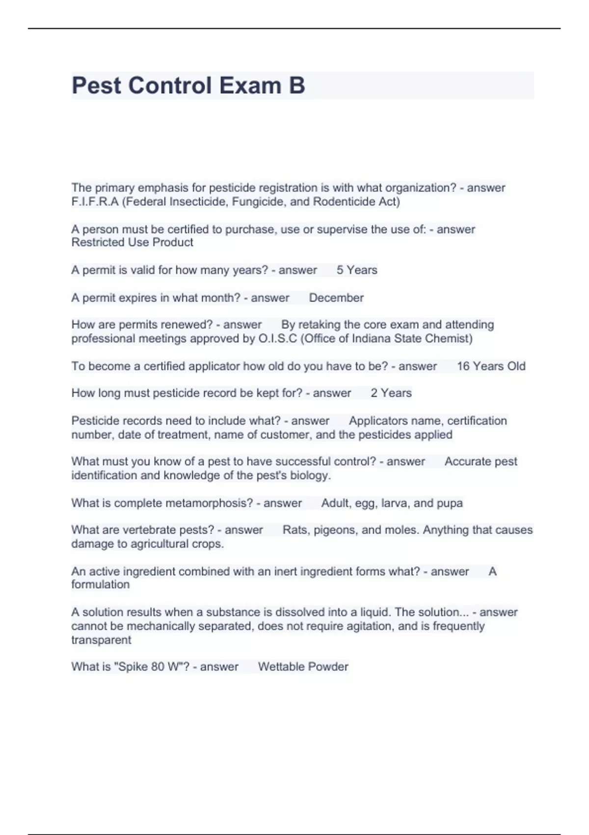 Pest Control Exam B Questions with Answers 2024