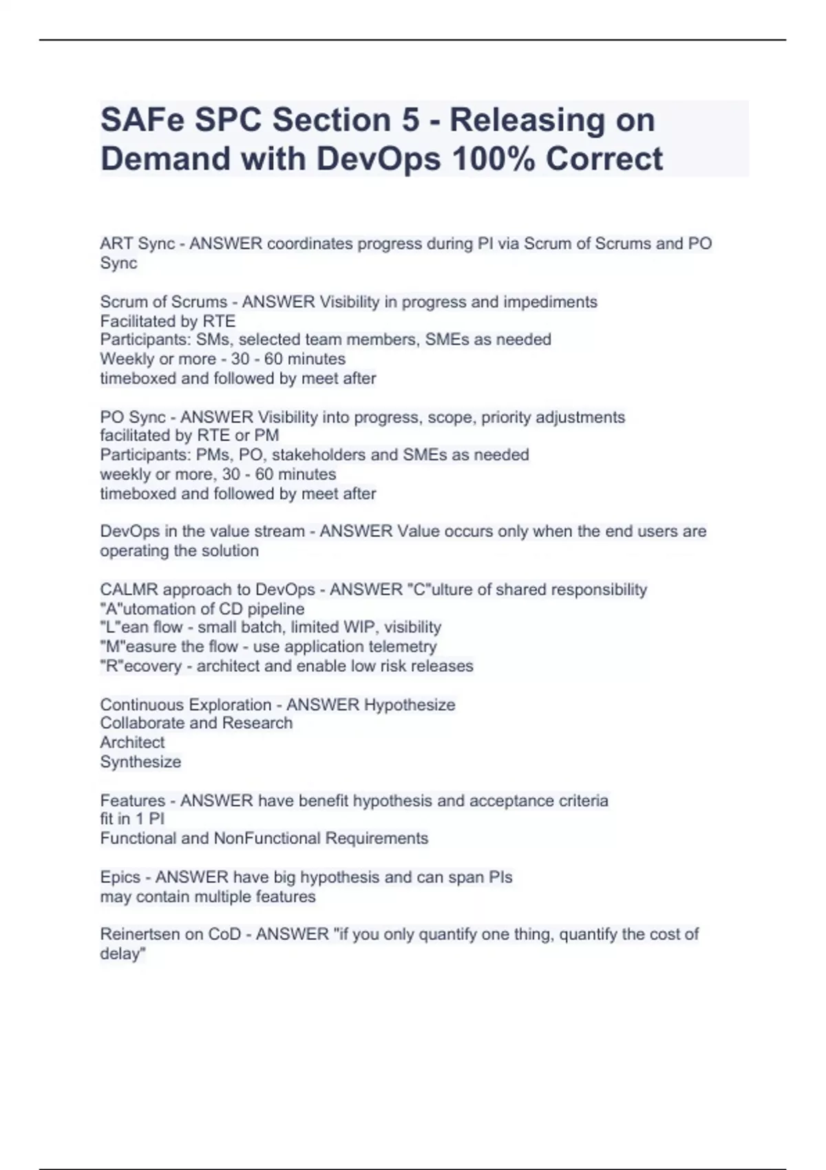 ART Sync - ANSWER coordinates progress during PI via Scrum of Scrums and PO Sync Scrum of Scrums - ANSWER Visibility in progress and impediments Facilitated by RTE Participants: SMs, selected team members, SMEs as needed Weekly or more - 30 - 60 minutes timeboxed and followed by meet after PO Sync - ANSWER Visibility into progress, scope, priority adjustments facilitated by RTE or PM Participants: PMs, PO, stakeholders and SMEs as needed weekly or more, 30 - 60 minutes timeboxed and followed by meet after DevOps in the value stream - ANSWER Value occurs only when the end users are operating the solution CALMR approach to DevOps - ANSWER "C"ulture of shared responsibility "A"utomation of CD pipeline "L"ean flow - small batch, limited WIP, visibility "M"easure the flow - use application telemetry "R"ecovery - architect and enable low risk releases Continuous Exploration - ANSWER Hypothesize Collaborate and Research Architect Synthesize Features - ANSWER have benefit hypothesis and acceptance criteria fit in 1 PI Functional and NonFunctional Requirements Epics - ANSWER have big hypothesis and can span PIs may contain multiple features