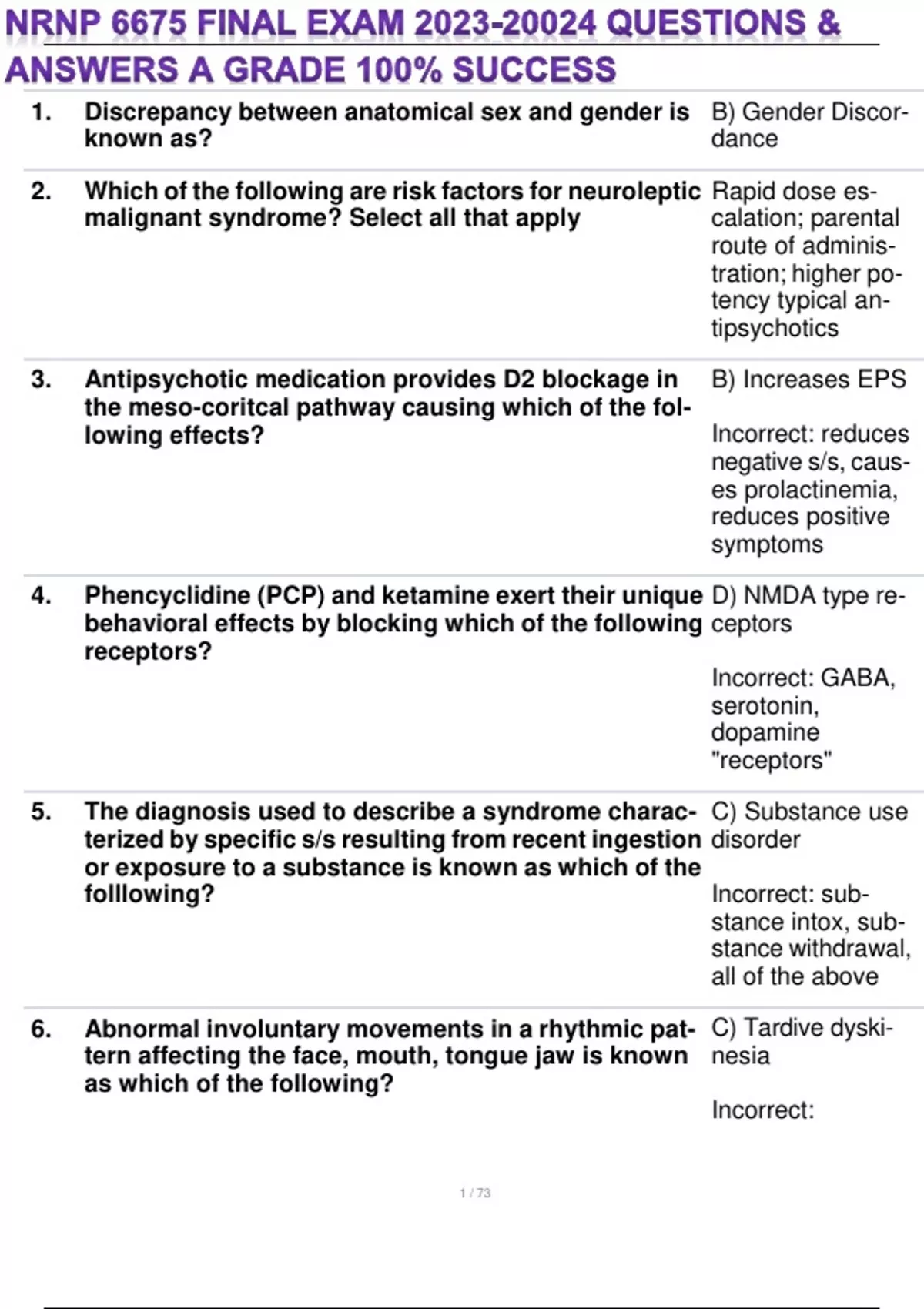 NRNP 6675 FINAL EXAM QUESTIONS & ANSWERS A GRADE 100% SUCCESS 1. Discrepancy between anatomical sex and gender is known as? 2. Which of the following are risk factors for neuroleptic malignant syndrome? Select all that apply 3. Antipsychotic medication provides D2 blockage in the meso-coritcal pathway causing which of the fol- lowing effects? 4. Phencyclidine (PCP) and ketamine exert their unique behavioral effects by blocking which of the following receptors? 5. The diagnosis used to describe a syndrome charac- terized by specific s/s resulting from recent ingestion or exposure to a substance is known as which of the folllowing? 6. Abnormal involuntary movements in a rhythmic pat- tern affecting the face, mouth, tongue jaw is known as which of the following? B) Gender Discor- dance Rapid dose es- calation; parental route of adminis- tration; higher po- tency typical an- tipsychotics B) Increases EPS Incorrect: reduces negative s/s, caus- es prolactinemia, reduces positive symptoms D) NMDA type re- ceptors Incorrect: GABA, serotonin, dopamine "receptors" C) Substance use disorder Incorrect: sub- stance intox, sub- stance withdrawal, all of the above C) Tardive dyski- nesia Incorrect: akathisia, dystonia, EPS 7. A deeply held belief despite evidence to the contrary, Delusional disor- lasting at least 1 month, without prominent hallucina- tions, with functional impairment that relates to the delusional system disorder called? 8. Which of the following is true about preoccupation with castration? 9. Which of the following is a system that provides a uniform language for describing medical and surgi- der A) This can be serious and life threatening if cas- tration is carried out without med- ical supervision Incorrect: consis- tent with transves- tiatic disorder, oth- er specified para- phillic disorder, or sexual ma- chochism disorder CPT cal procedures and diagnostics services rendered by Incorrect: HIPPA, clinicians? 10. A patient on Chlorpromazine states his orgasm is dry and afterwards he will commonly have milky urine. The APRN realizes this is which of the following? 11. A condition which results from absence of second female sex chromosome (XO) and is associated with web neck, dwarfism, cubitus valgus and infertility is known as which of the following? DSM5-, DRG A) This is like- ly a harmless re- sponse to the Chlorpromazine "Thorazine" B) Turners Syn- drome Turners syn- drome: 12. Which of the following would be characterized as a negative s/s of schizophrenia? 13. Which of the following are keys to distinguishing OCD from psychosis? 14. A federal program administered nationally and locally which covers enrolled individuals 65+ who pays pre- miums and disabled individuals 15. Having an adequate legal description of nurse prac- titioner (NP) scope of practice according to state law is important for which of the following reasons? tx involves hor- mone therapy; fer- tility treatments for women when they decide to have a baby B & C only B) impaired social and occupational functioning C) isolation and impaired self-care Patients with OCD can almost always acknowledge the unreasonable na- ture of their symp- toms Both A& B (Medicare and Medicaid) All of the above (to avoid any charges of practic- ing medicine with- out a license, to place accountabil- ity for both bene- fits and harm to patients squarely on the NP, to get reimbursed for physician services 16. Which of the following is the most widely consumed psychoactive substance? when provided by a NP B) Caffeine Incorrect: alcohol, heroin, cannabis 17. Which of the following is used to tx TD? None of the above (cogentin, artane, catapress) 18. The APRN consensus model did which of the follow- ing? 19. Which of the following behaviors are associated with an alcohol blood level of 0.05%? 20. According to HIPPA, which of the following must the NP share their NPI with? Check all the above 21. A patient presents with delusions, disorganized thoughts, and speech with poor self care all of which B & C B) adult and gerontology were merged and iden- tified as PCP or acute care C) psychiatric mental health foci were stipulated as across the lifes- pan B) Thought judge- ment and re- straints are im- paired A) Health Plans B) Other providers C) Any entity that may need it for a billing purpose Schizophrenia has persisted for the past 7 months. The APRN knowns this presentation means what diagnosis?