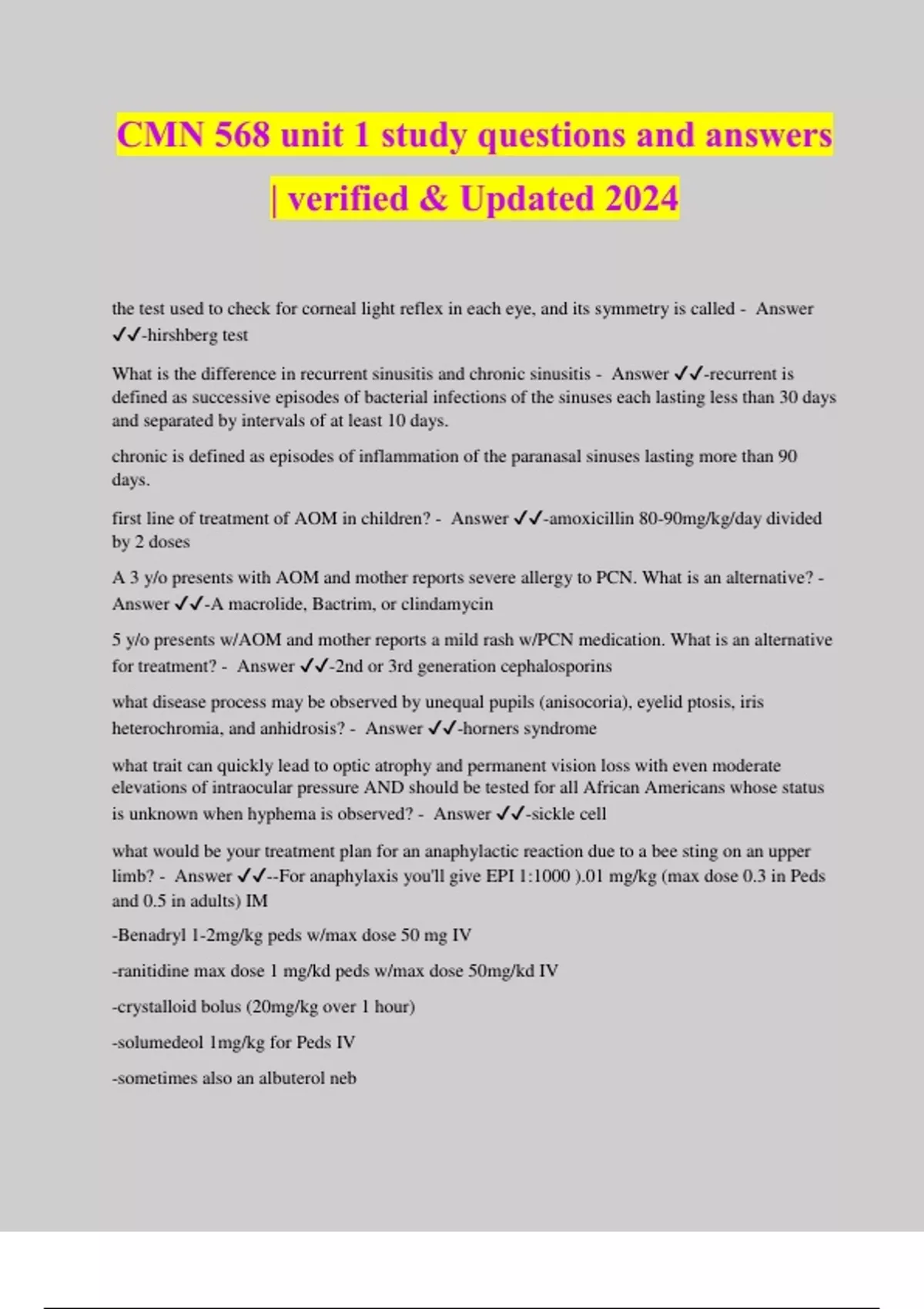 CMN 568 unit 1 study questions and answers | verified & Updated 2024 the test used to check for corneal light reflex in each eye, and its symmetry is called - Answer ️️ -hirshberg test What is the difference in recurrent sinusitis and chronic sinusitis - Answer ️️ -recurrent is defined as successive episodes of bacterial infections of the sinuses each lasting less than 30 days and separated by intervals of at least 10 days. chronic is defined as episodes of inflammation of the paranasal sinuses lasting more than 90 days. first line of treatment of AOM in children? - Answer ️️ -amoxicillin 80-90mg/kg/day divided by 2 doses A 3 y/o presents with AOM and mother reports severe allergy to PCN. What is an alternative? - Answer ️️ -A macrolide, Bactrim, or clindamycin 5 y/o presents w/AOM and mother reports a mild rash w/PCN medication. What is an alternative for treatment? - Answer ️️ -2nd or 3rd generation cephalosporins what disease process may be observed by unequal pupils (anisocoria), eyelid ptosis, iris heterochromia, and anhidrosis? - Answer ️️ -horners syndrome what trait can quickly lead to optic atrophy and permanent vision loss with even moderate elevations of intraocular pressure AND should be tested for all African Americans whose status is unknown when hyphema is observed? - Answer ️️ -sickle cell what would be your treatment plan for an anaphylactic reaction due to a bee sting on an upper limb? - Answer ️️ --For anaphylaxis you'll give EPI 1:1000 ).01 mg/kg (max dose 0.3 in Peds and 0.5 in adults) IM -Benadryl 1-2mg/kg peds w/max dose 50 mg IV -ranitidine max dose 1 mg/kd peds w/max dose 50mg/kd IV -crystalloid bolus (20mg/kg over 1 hour) -solumedeol 1mg/kg for Peds IV -sometimes also an albuterol neb what are the most common antibiotics to cause anaphylaxis - Answer ️️ -amoxicillin ampicillin TMP-SMZ (trimethoprim-sulfonamide) what is the 1st line of treatment for allergic rhinitis - Answer ️️ --non-sedating antihistamines: LORATADINE, CETRIZINE -intranasal corticosteroids -mast cell stabilizers: CROMOLYN -Montelukast: SINGULAR what is the 1st line treatment for Bacterial Rhinosinusitis in adults? - Answer ️️ -OTC NSAIDS or acetaminophen nasal corticosteroids decongestants -diagnosis is made when symptoms last longer than 10 days w/o improvement OR worsening of symptoms w/in 20 days after initial improvement of symptoms. -for pts w/focal signs such as periorbital edema, severe sinus tenderness, or severe headache--do not wait 10 days for antibiotics ------1st line therapy: amoxicillin, bactrim, doxycycline, amoxicillian-clavulanate ------1st line therapy after recent abx use: levofloxacin, amoxicillain-clavulanate what antibiotic do you avoid if you think the patient may have mono? - Answer ️️ -amoxicillin b/c drug often precipitates a rash every pt who complains of hearing loss should be referred for audiologic evaluation except in what scenario? - Answer ️️ -when the cause is easily remedi