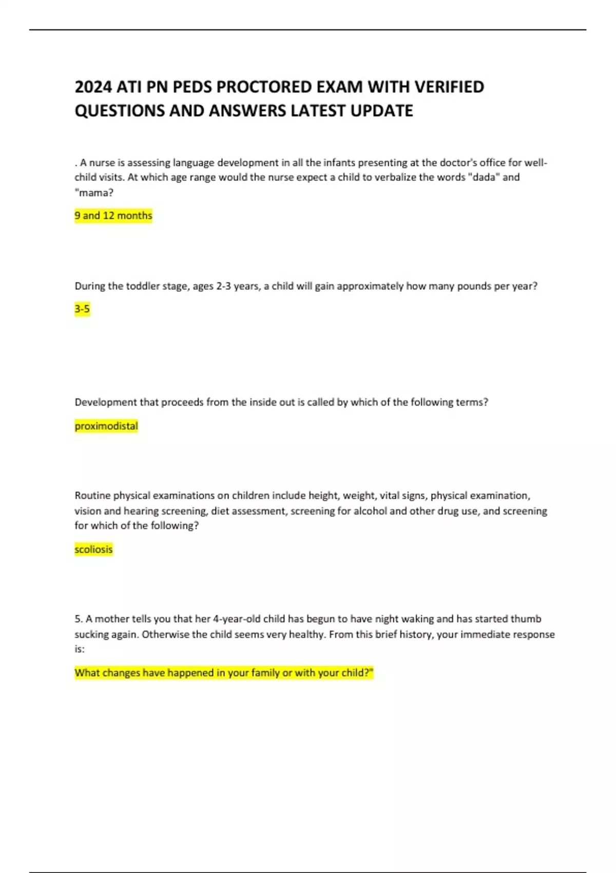 2024 ATI PN PEDS PROCTORED EXAM WITH VERIFIED QUESTIONS AND ANSWERS LATEST UPDATE 2024 ATI PN PEDS PROCTORED EXAM WITH VERIFIED QUESTIONS AND ANSWERS LATEST UPDATE . A nurse is assessing language development in all the infants presenting at the doctor's office for wellchild visits. At which age range would the nurse expect a child to verbalize the words "dada" and "mama? 9 and 12 months During the toddler stage, ages 2-3 years, a child will gain approximately how many pounds реr year? 3-5 Development that proceeds from the inside out is called by which of the following terms? proximodistal