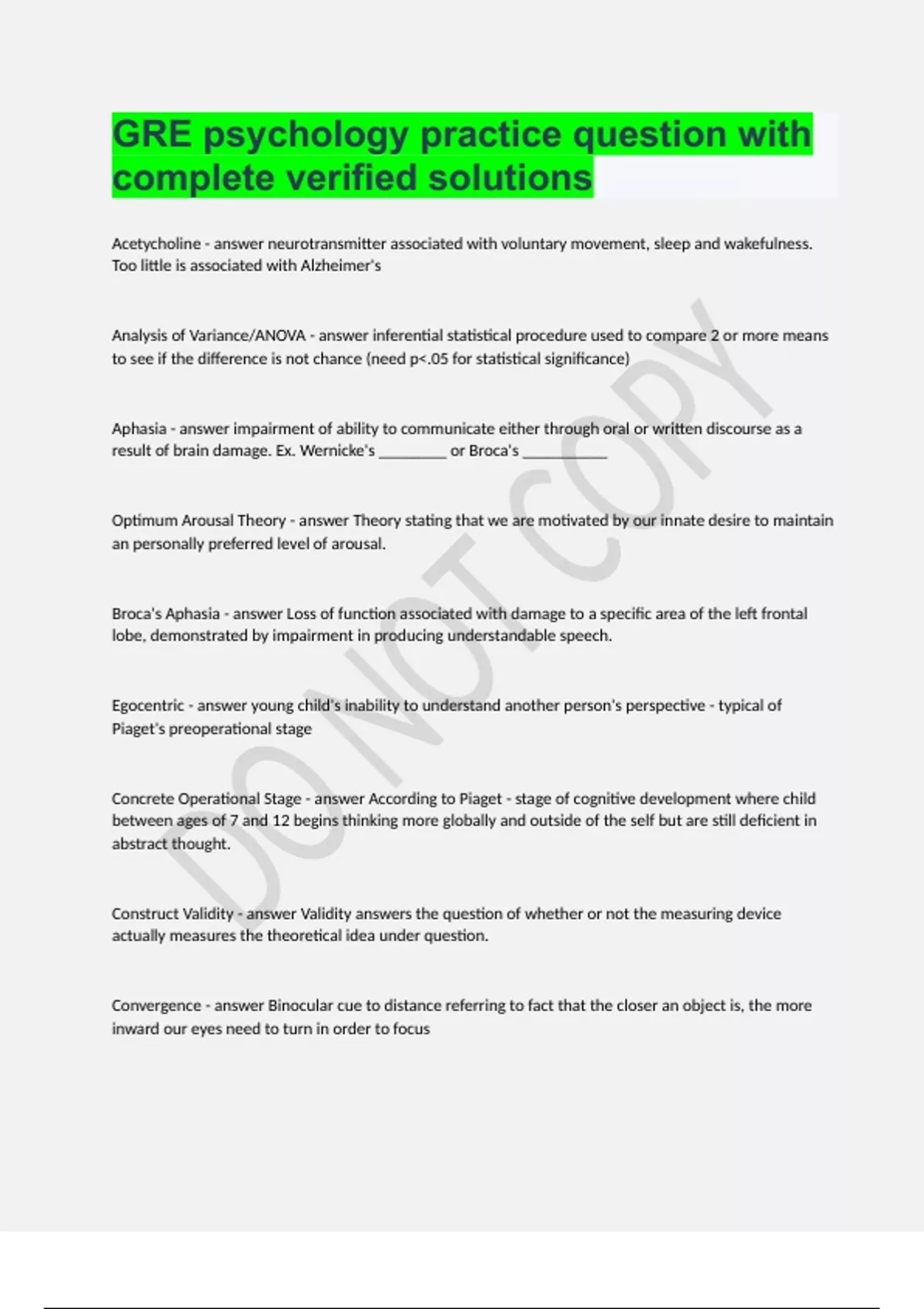 Acetycholine neurotransmitter associated with voluntary movement, sleep and wakefulness. Too little is associated with Alzheimer's Analysis of Variance/ANOVA inferential statistical procedure used to compare 2 or more means to see if the difference is not chance (need p<.05 for statistical significance) 6 Ways to Show Appreciation for Your Child's Teacher Previous Play Next Rewind 10 seconds Move forward 10 seconds Unmute 0:13 / 0:54 Full screen Aphasia impairment of ability to communicate either through oral or written discourse as a result of brain damage. Ex. Wernicke's ________ or Broca's __________ Optimum Arousal Theory Theory stating that we are motivated by our innate desire to maintain an personally preferred level of arousal. Broca's Aphasia Loss of function associated with damage to a specific area of the left frontal lobe, demonstrated by impairment in producing understandable speech. Egocentric young child's inability to understand another person's perspective - typical of Piaget's preoperational stage Concrete Operational Stage According to Piaget - stage of cognitive development where child between ages of 7 and 12 begins thinking more globally and outside of the self but are still deficient in abstract thought. Construct Validity Validity answers the question of whether or not the measuring device actually measures the theoretical idea under question. Convergence Binocular cue to distance referring to fact that the closer an object is, the more inward our eyes need to turn in order to focus Dopamine Hypothesis Theory that schizophrenia is caused by an excess amount of dopamine in brain. Research has found that medication to reduce dopamine can reduce the positive symptoms of schizophrenia. Endorphins neurotransmitter involved in pain relief, and feelings of pleasure and contentedness. Epinephrine neurotransmitter involved in energy and glucose metabolism. External Validity The extent to which data collected from a sample can be generalized to the entire population. Factor Analysis A statistical technique used combine data into similar groups Frequency Effect The phenomenon in memory which states that we tend to remember information better if it is repeated. Formal Operational Stage Piaget's fourth and final stage of cognitive development where thinking becomes more abstract. 12+ years Frustration-Aggression Hypothesis Theory arguing that aggression is the natural reaction to frustration. g factor Basic intelligence of Spearman's theory. Typically compared to s which represents specific intelligences. Gender Identity Internal sense of being either male or female. Usually congruent with biological gender, but not always. Hawthorne Effect Phenomenon that subject behavior changes by mere fact that they are being observed. Introspection The process of examining one's own consciousness used by Structuralists and Functionalist researchers Legitimate Power Power derived through one's position, such as a police officer or elected official. Motive Internal states that provide direction for one's behaviors. Norepinephrine neurotransmitter associated with eating and alertness. Too little has been associated with depression in addition to serotonin Overlearning A technique used to improve memory where info is learned to the point that it can be repeated without mistake more than one time. Continuted rehearsal after material is leanred - Ebbinghaus Phi Phenomenon The perception of motion based on two or more stationary objects (e.g., perception of chaser lights brought about by different lights blinking at different times). Criterion Validity A measurements ability to predict scores on another measurement that is related or purports to measure the same or similar construct Preoperational Stage Piaget's second stage of cognitive development in which a child develops objects permanency and language. 2-7 years Proactive Interference Interference in memory due to prior learning. r Symbol used for the Pearson-product moment correlation (correlation coefficien Reaction Formation defense mechanism where unacceptable impulses are converted to their opposite. Reticular Formation (Reticular Activating System) Part of brain stem involved in arousal and attention, sleep and wakefulness, and control of reflexes. Retinal Disparity Binocular cue to distance referring to distance between the two images sent to the brain by our eyes. The farther apart these images, the closer the object. Retroactive Interference Interference in memory created by later learning. Self Serving Bias The tendency to assign internal attributes to successes and external factors to failures. Sensorimotor Stage The first stage in Piaget's Stages of Cognitive Development where a child's primary way of learning about the world is through the senses and movement. 0-2 years Structuralism Wundt and Titchner school of thought from the 19th century focused on the gathering of psychological information through the examination of the structure of the mind. Type I Error The error that is committed when a true null hypothesis is rejected erroneously. The probability of a Type I Error is abbreviated with the lowercase Greek letter alpha. Type II Error The error that is committed when a false null hypothesis is accepted erroneously. The probability of a Type II Error is abbreviated with the uppercase Greek letter beta. Variance A measure of spread within a distribution (the square of the standard deviation). Wernicke's Aphasia Aphasia resulting from damage to a specific area of left temporal lobe. Affects written and spoken language. visual capture the tendency for vision to dominate the other senses feature detectors nerve cells in the brain's visual cortex that respond to specific features of the stimulus, such as shape, angle, or movement