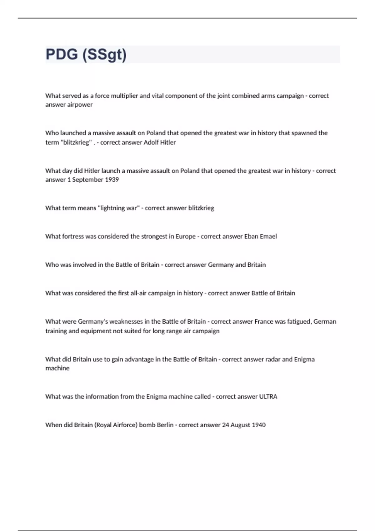 PDG Question and answers correctly solved 2023/2024 What served as a force multiplier and vital component of the joint combined arms campaign - correct answer airpower Who launched a massive assault on Poland that opened the greatest war in history that spawned the term "blitzkrieg" . - correct answer Adolf Hitler What day did Hitler launch a massive assault on Poland that opened the greatest war in history - correct answer 1 September 1939 What term mean