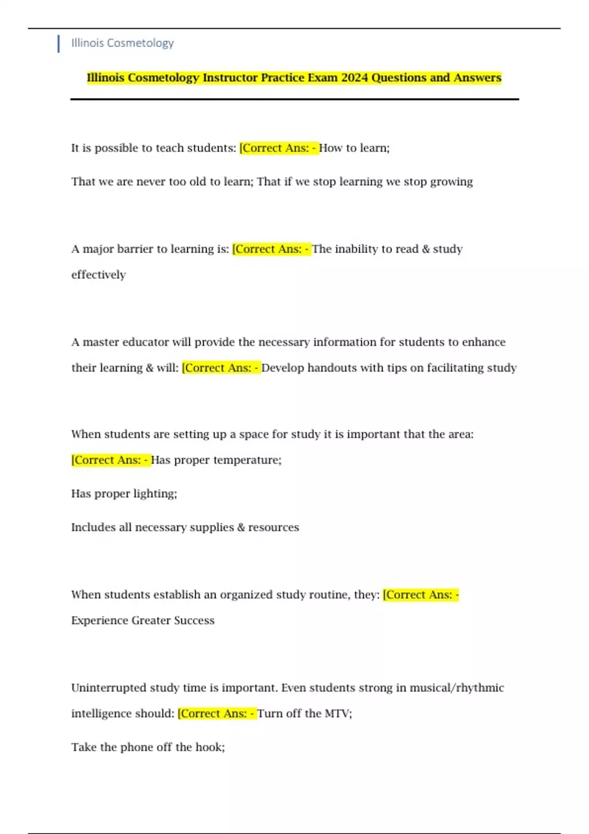 Illinois Cosmetology Instructor Practice Exam 2024 Questions and Answers