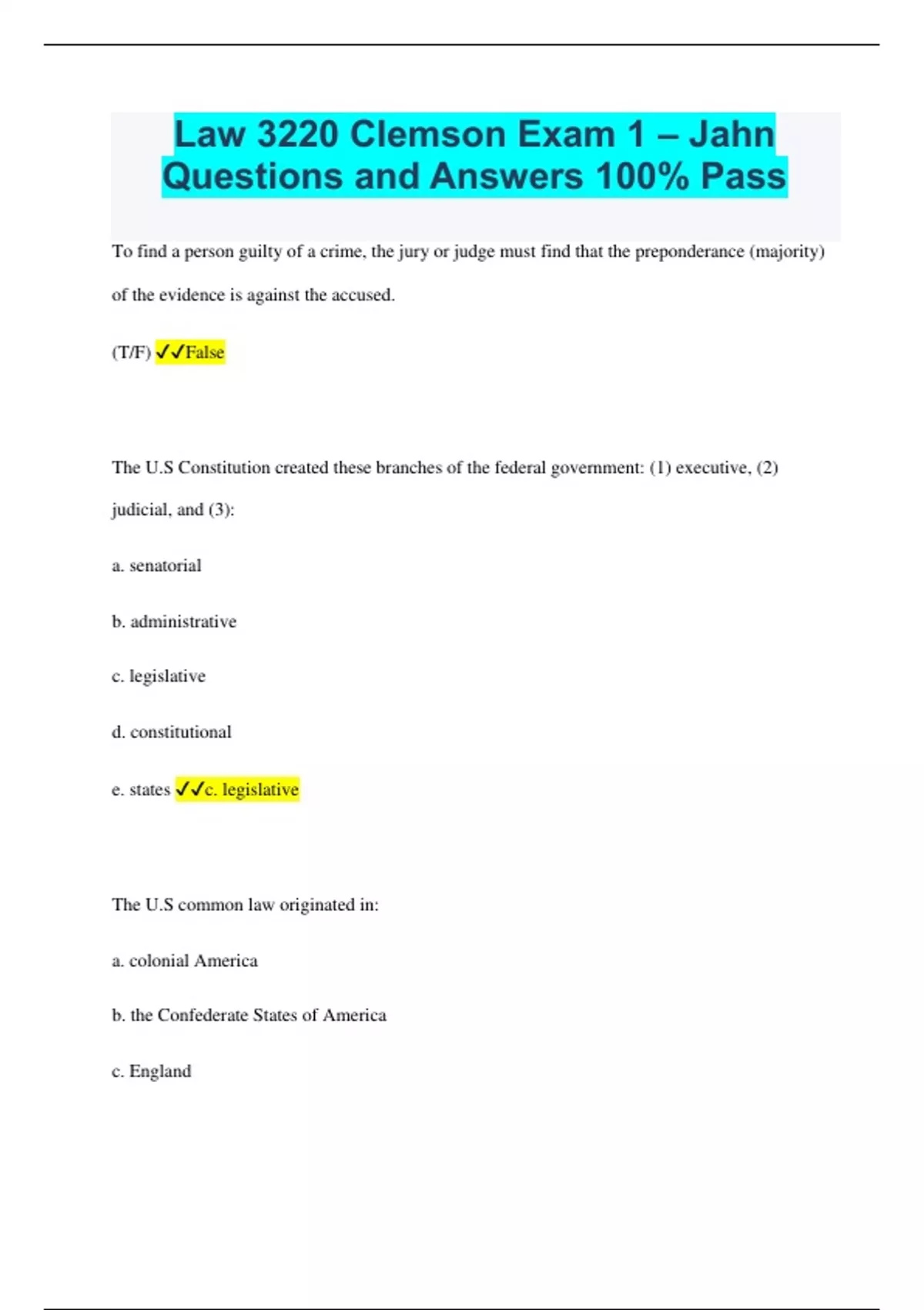 Law 3220 Clemson Exam 1 – Jahn Questions and Answers 100% Pass