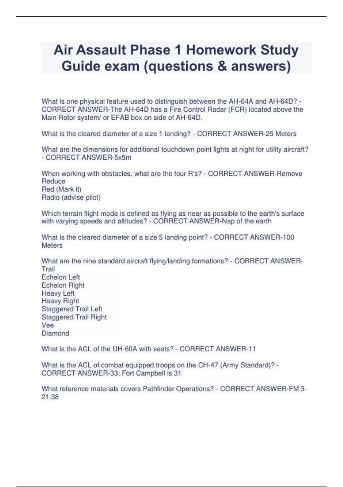Air Assault Phase 1 Homework Study Guide exam (questions & answers) What is one physical feature used to distinguish between the AH-64A and AH-64D? - CORRECT ANSWER-The AH-64D has a Fire Control Radar (FCR) located above the Main Rotor system/ or EFAB box on side of AH-64D. What is the cleared diameter of a size 1 landing? - CORRECT ANSWER-25 Meters What are the dimensions for additional touchdown point lights at night for utility aircraft? - CORRECT ANSWER-5x5m When working with obstacles, what are the four R's? - CORRECT ANSWER-Remove Reduce Red (Mark it) Radio (advise pilot) Which terrain flight mode is defined as flying as near as possible to the earth's surface with varying speeds and altitudes? - CORRECT ANSWER-Nap of the earth What is the cleared diameter of a size 5 landing point? - CORRECT ANSWER-100 Meters What are the nine standard aircraft flying/landing formations? - CORRECT ANSWERTrail Echelon Left Echelon Right Heavy Left Heavy Right Staggered Trail Left Staggered Trail Right Vee Diamond What is the ACL of the UH-60A with seats? - CORRECT ANSWER-11 What is the ACL of combat equipped troops on the CH-47 (Army Standard)? - CORRECT ANSWER-33; Fort Campbell is 31 What reference materials covers Pathfinder Operations? - CORRECT ANSWER-FM 3- 21.38 There are 3 portions of the aircraft that you must avoid at all times, what are they? - CORRECT ANSWER-1. Main rotor 2. Tail Rotor 3. Cargo hook How many Red Cross markings are on the HH-60? - CORRECT ANSWER-5 Markings If the aircraft catches fire, what is the first thing you are going to do? - CORRECT ANSWER-Exit immediately (use common sense) Who is the nucleus of the Air Assault Task Force? - CORRECT ANSWER-Infantry The OH-58D Kiowa Warrior has a cruising speed of what? - CORRECT ANSWER-80 Knots UH-60A has a hook or lift capacity of what? - CORRECT ANSWER-8,000lbs How many medics are assigned to the crew of a CH-47 during mass casualty evacuation? - CORRECT ANSWER-No medics are "assigned" to the CH-47D/F. (But, during a mass casusalty or MASCAL evacuation, the CH-47D/F requires one medic for every six casualties.) Who is overall responsible for the Air Assault mission? - CORRECT ANSWER-PL/OIC What is the distance between the base light and the number one touchdown point? - CORRECT ANSWER-14 meters Who collects all personnel and equipment left behind on the PZ? - CORRECT ANSWER-The Straggler Control Team What is known as using the mobility of rotary wing assets and total integration of available fire-power, maneuvering under the control of a ground or air maneuver commander to engage enemy forces or to seize and hold key terrain? - CORRECT ANSWER-Air Assault Operations What is the cleared diameter of a size 4 land point? - CORRECT ANSWER-80 Meters In what direction do the windows fall on the UH-60? - CORRECT ANSWER-Down and out What are the five stages of the reverse planning system? - CORRECT ANSWER-1. Ground Tactical Plan 2. Landing Plan 3. Air movement plan 4. Loading plan 5. Staging Plan
