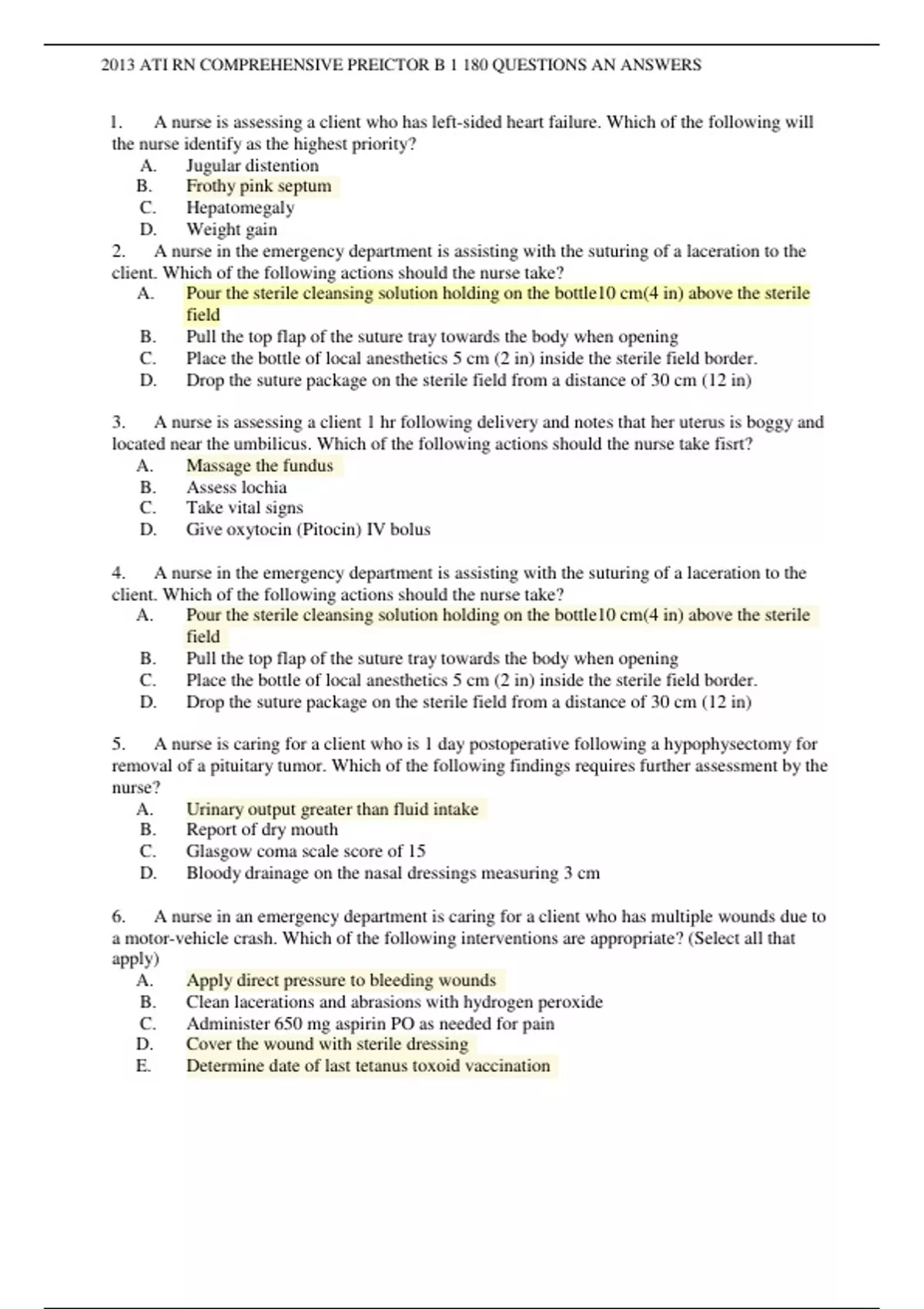 1. A nurse is assessing a client who has left-sided heart failure. Which of the following will the nurse identify as the highest priority? A. Jugular distention B. Frothy pink septum C. Hepatomegaly D. Weight gain 2. A nurse in the emergency department is assisting with the suturing of a laceration to the client. Which of the following actions should the nurse take? A. Pour the sterile cleansing solution holding on the bottle10 cm(4 in) above the sterile field B. Pull the top flap of the suture tray towards the body when opening C. Place the bottle of local anesthetics 5 cm (2 in) inside the sterile field border. D. Drop the suture package on the sterile field from a distance of 30 cm (12 in) 3. A nurse is assessing a client 1 hr following delivery and notes that her uterus is boggy and located near the umbilicus. Which of the following actions should the nurse take fisrt? A. Massage the fundus B. Assess lochia C. Take vital signs D. Give oxytocin (Pitocin) IV bolus 4. A nurse in the emergency department is assisting with the suturing of a laceration to the client. Which of the following actions should the nurse take? A. Pour the sterile cleansing solution holding on the bottle10 cm(4 in) above the sterile field B. Pull the top flap of the suture tray towards the body when opening C. Place the bottle of local anesthetics 5 cm (2 in) inside the sterile field border. D. Drop the suture package on the sterile field from a distance of 30 cm (12 in) 5. A nurse is caring for a client who is 1 day postoperative following a hypophysectomy for removal of a pituitary tumor. Which of the following findings requires further assessment by the nurse? A. Urinary output greater than fluid intake B. Report of dry mouth C. Glasgow coma scale score of 15 D. Bloody drainage on the nasal dressings measuring 3 cm 6. A nurse in an emergency department is caring for a client who has multiple wounds due to a motor-vehicle crash. Which of the following interventions are appropriate? (Select all that apply) A. Apply direct pressure to bleeding wounds B. Clean lacerations and abrasions with hydrogen peroxide C. Administer 650 mg aspirin PO as needed for pain D. Cover the wound with sterile dressing E. Determine date of last tetanus toxoid vaccination