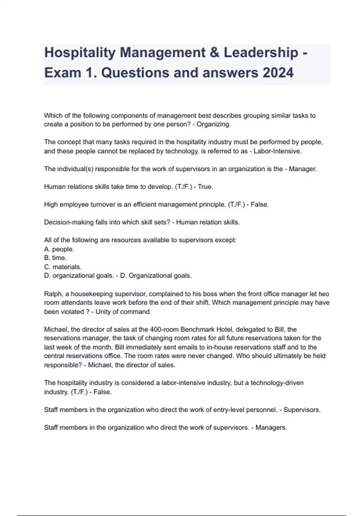 Hospitality Management & Leadership - Exam 1. Questions and answers 2024 Which of the following components of management best describes grouping similar tasks to create a position to be performed by one person? - Organizing. The concept that many tasks required in the hospitality industry must be performed by people, and these people cannot be replaced by technology, is referred to as - Labor-Intensive. The individual(s) responsible for the work of supervisors in an organization is the - Manager. Human relations skills take time to develop. (T./F.) - True. High employee turnover is an efficient management principle. (T./F.) - False. Decision-making falls into which skill sets? - Human relation skills. All of the following are resources available to supervisors except: A. people. B. time. C. materials. D. organizational goals. -