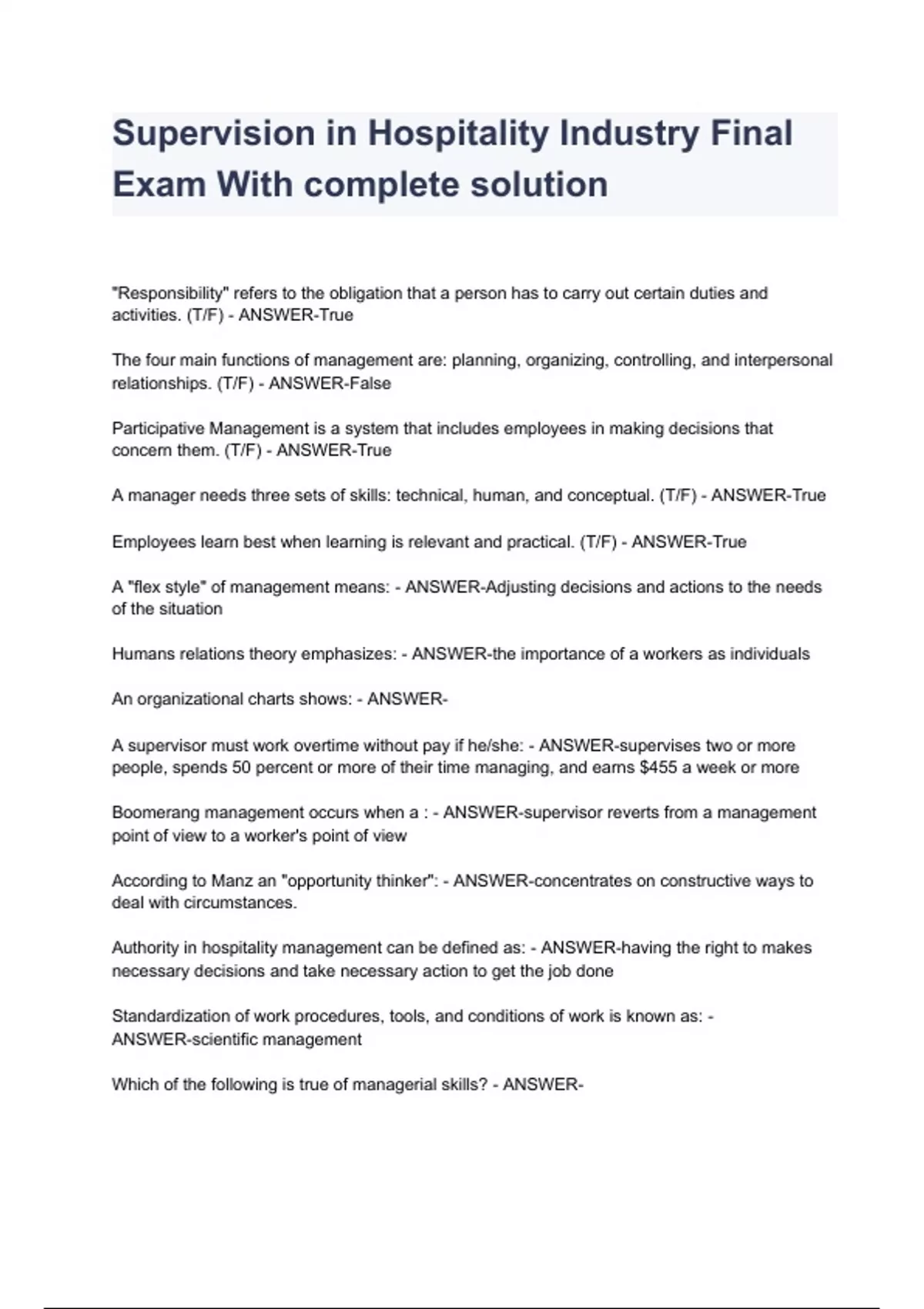 Supervision in Hospitality Industry Final Exam With complete solution "Responsibility" refers to the obligation that a person has to carry out certain duties and activities. (T/F) - ANSWER-True The four main functions of management are: planning, organizing, controlling, and interpersonal relationships. (T/F) - ANSWER-False Participative Management is a system that includes employees in making decisions that concern them. (T/F) - ANSWER-True A manager needs three sets of skills: technical, human, and conceptual. (T/F) - ANSWER-True Employees learn best when learning is relevant and practical. (T/F) - ANSWER-True