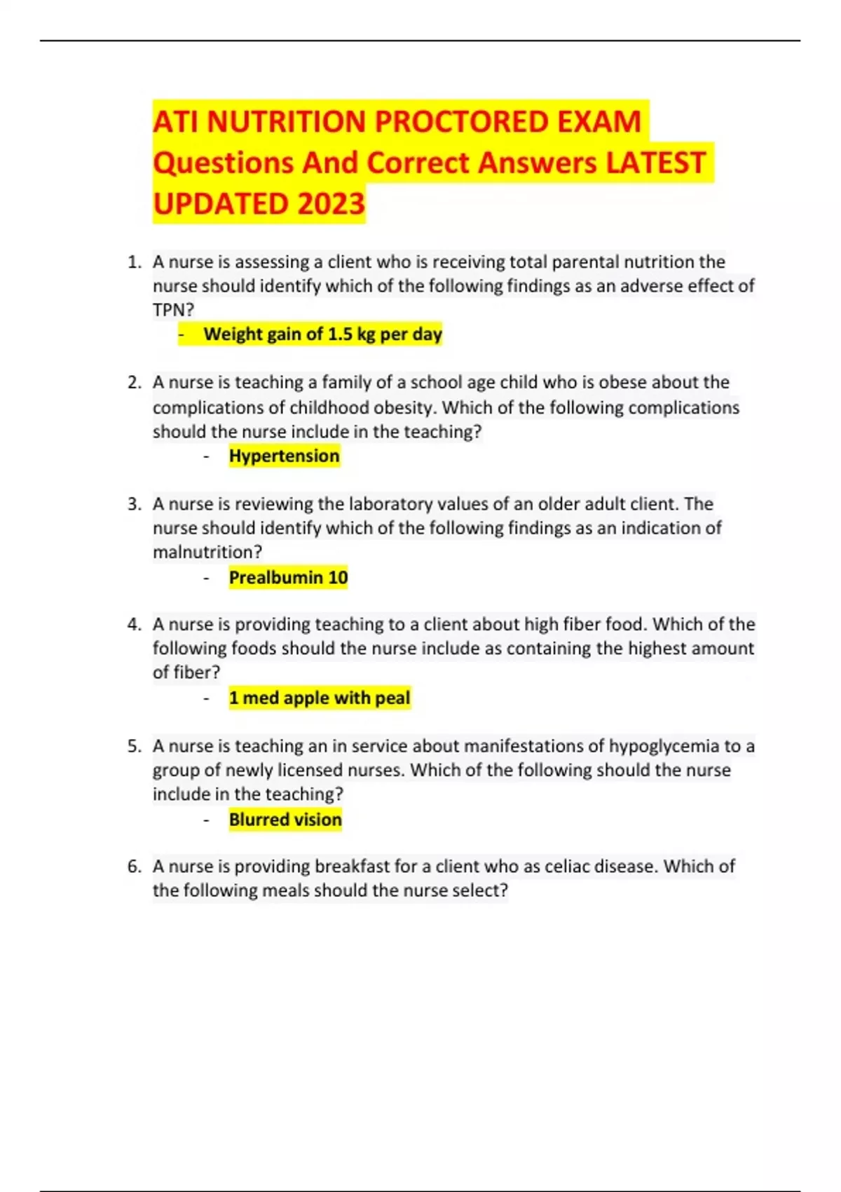 ATI NUTRITION PROCTORED EXAM Questions And Correct Answers LATEST UPDATED 2023 1. A nurse is assessing a client who is receiving total parental nutrition the nurse should identify which of the following findings as an adverse effect of TPN? - Weight gain of 1.5 kg per day 2. A nurse is teaching a family of a school age child who is obese about the complications of childhood obesity. Which of the following complications should the nurse include in the teaching? - Hypertension 3. A nurse is reviewing the laboratory values of an older adult client. The nurse should identify which of the following findings as an indication of malnutrition? - Prealbumin 10 4. of fiber? - 1 med apple with peal 5. A nurse is teaching an in service about manifestations of hypoglycemia to a group of newly licensed nurses. Which of the following should the nurse include in the teaching? - Blurred vision