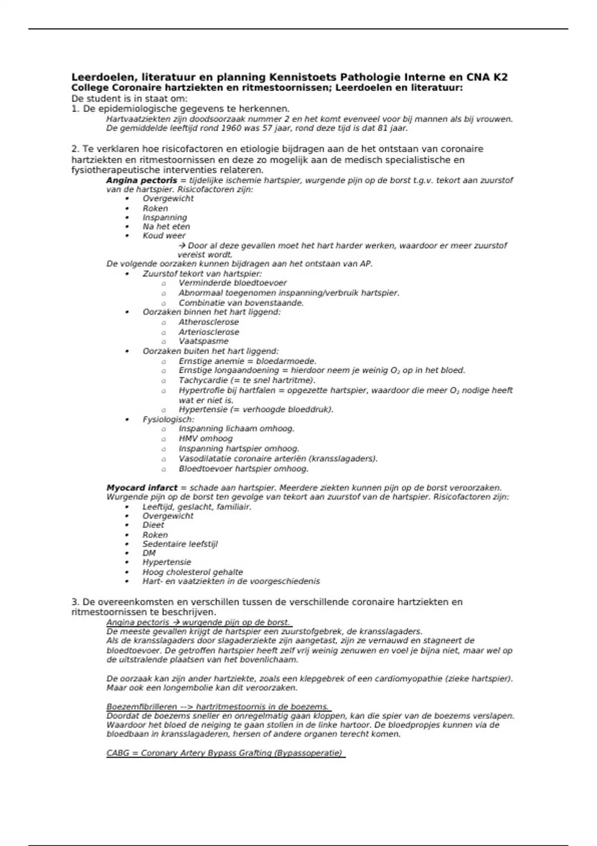 Deze samenvatting heb ik gemaakt door het beantwoorden van de leerdoelen uit de toetsmatrijs voor de kennistoets aan de hand van de literatuur. Met deze uitwerking van de leerdoelen is het gemakkelijk om de vragen tijdens de toets te kunnen beantwoorden aangezien alle vragen meerkeuze zijn én volgens de leerdoelen worden gesteld. Deze samenvatting is specifiek voor het blok interne/neuro in leerjaar 2 van de opleiding tot fysiotherapeut op Hogeschool Saxion in Enschede, maar kan ook voor andere fysio-opleiding in Nederland worden gebruikt.