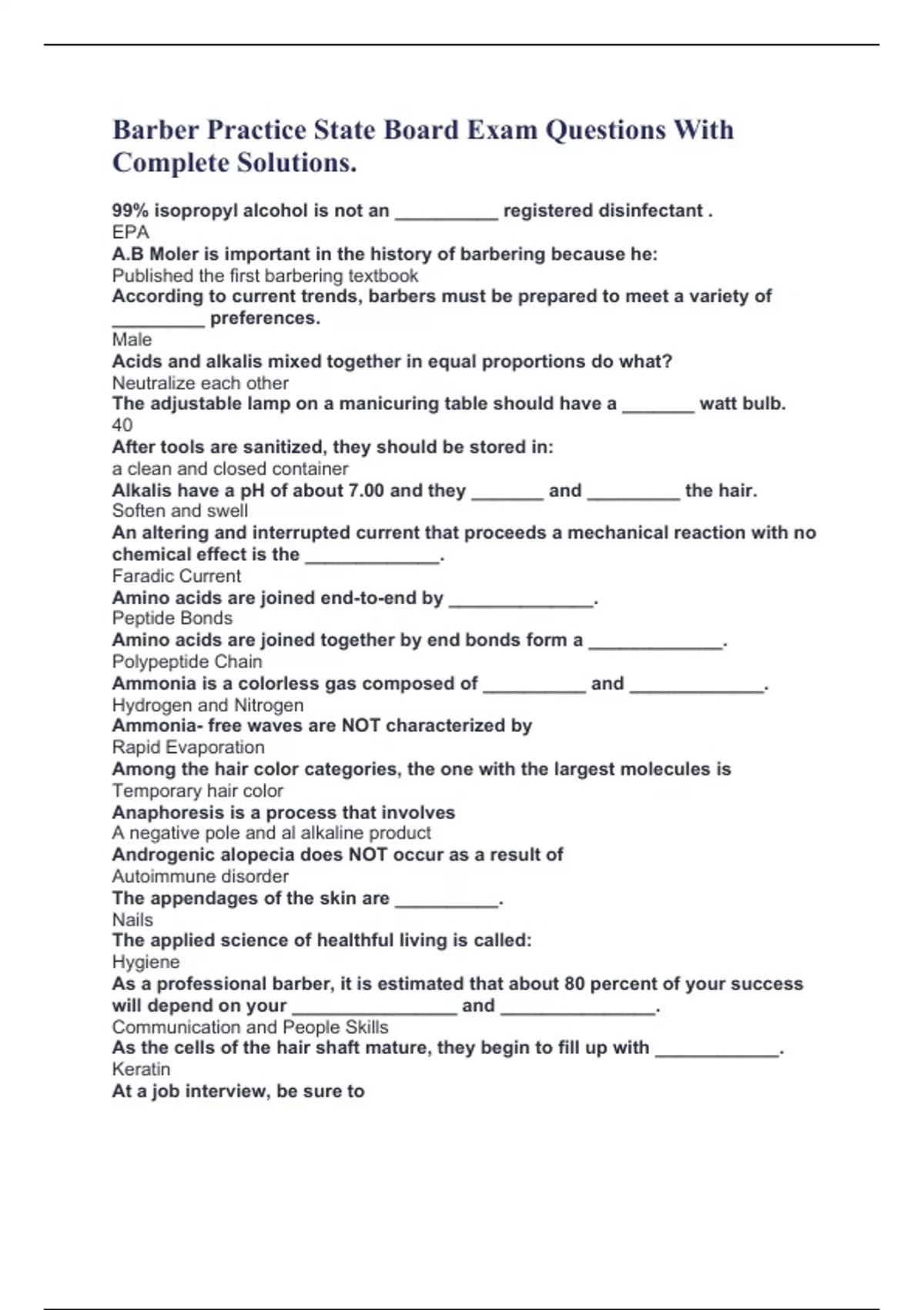 Barber Practice State Board Exam Questions With Complete Solutions. 99% isopropyl alcohol is not an __________ registered disinfectant . EPA A.B Moler is important in the history of barbering because he: Published the first barbering textbook According to current trends, barbers must be prepared to meet a variety of _________ preferences. Male Acids and alkalis mixed together in equal proportions do what? Neutralize each other The adjustable lamp on a manicuring table should have a _______ watt bulb. 40 After tools are sanitized, they should be stored in: a clean and closed container Alkalis have a pH of about 7.00 and they _______ and _________ the hair. Soften and swell An altering and interrupted current that proceeds a mechanical reaction with no chemical effect is the _____________. Faradic Current Amino acids are joined end-to-end by ______________. Peptide Bonds Amino acids are joined together by end bonds form a _____________. Polypeptide Chain Ammonia is a colorless gas composed of __________ and _____________. Hydrogen and Nitrogen Ammonia- free waves are NOT characterized by Rapid Evaporation Among the hair color categories, the one with the largest molecules is Temporary hair color Anaphoresis is a process that involves A negative pole and al alkaline product Androgenic alopecia does NOT occur as a result of Autoimmune disorder The appendages of the skin are __________. Nails The applied science of healthful living is called: Hygiene As a professional barber, it is estimated that about 80 percent of your success will depend on your ________________ and _______________. Communication and People Skills As the cells of the hair shaft mature, they begin to fill up with ____________. Keratin At a job interview, be sure to Answer questions honestly The atoms of neighboring cysteine amino acids that are joined together by disulfide bonds are atoms of __________. Sulfur The atria are called the: Upper chambers of the heart Bacili often cause _______________. Tubercuiosis A barber apprentice in the barbershop must be under the constant and supervision of a/an ____________. Licensed Barber A barber should not service clients with Ringworm The barber-surgeon who is considered the greatest surgeon of the Renaissance and the father of modern surgery is _____________. Ambroisa Pare Barbering began to emerge as an independent profession by the _________ century. 19th A beard may be recommended to slim a/an _____________ face. Pear-Shaped Before application, Oxidation tints must be mixed with _________________. Hydrogen Peroxide Before, dry, brittle, damage or overprice hair is given a permanent wave, it should be _____________. Reconditioned Before and after photographs of your bet work should be present to potential employers in a ________________. Portfolio The best choice for a hairpiece generally is: Human hair The best choice of tonic lotion for mature or sensitive skins is a/an ___________ . Freshener The best form of advertising is: Clients speaking well of you The best shampoo for freshly permed hair is: Acid-Balanced Shampoo The best way to ascertain your clients expectations of a service is to : Organize your thoughts, clarify the clients wishes and repeat The blood circulation system that goes from the heart to the lungs and all the way back to the heart is The pulmonary circulation system The blood system that specifically defends against infection is the Immune system The bone that form the sides and top of the cranium, are the Parietal Bones The branches of the fifth cranial nerve affected by massage include the supraorbital nerve, zygomatic nerve and the Infraorbital nerve A business does not qualify as an established barbershop if It was in existence for less than a few years Certain chemical preparations can be absorbed into the skin through hair follicles and Sweat pores Chemical compounds that absorb and promote the retention of moisture in the hair are Humectants Chemical reactions that five off heat are called Exothermic Cleansing cream should be removed from the clients face with a Warm/Damp towel A clients total exposure to infrared rays should not last longer then 5 minutes Clipper or trimmer blades should never be adjusted flush to each other because doing can can cause Cause irritations, cut and ingrown hairs The cocci bacteria that causes abscesses, pustules, pimples and boils are Staphylococci A color change occurs in the hair when an oxidizer combines with the __________. Melanin The color of the skin depends on the melanin and Blood supply The condition in which the cuticle sticks to the nail and may grow over the nail to the free edge is called ______________. Pterygium The connection between two or more skeletal bones is called ______________. Joint A contagious disease is Transmitted from one person to another Corrective hair treatments deal with the Hair shaft The cortex accounts for about 90% of the hair's weight Cranial nerves are all connected to a part of the Brain surface Crew cuts include Include a variation called the brush cut The deep layer of the dermis is the Reticular layer