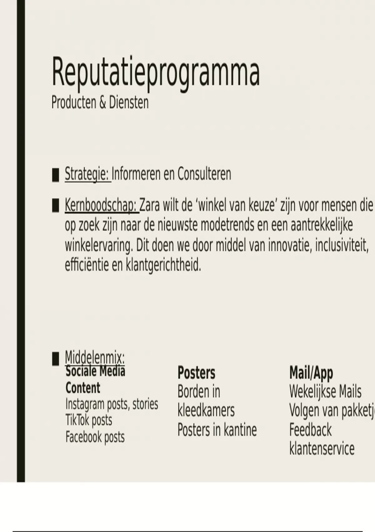 In deze korte presentatie staan de strategie en kernboodschap die nodig zijn voor de eindpresentatie. Deze presentatie is gebaseerd op de reputatie van Zara en dient als inspiratie.