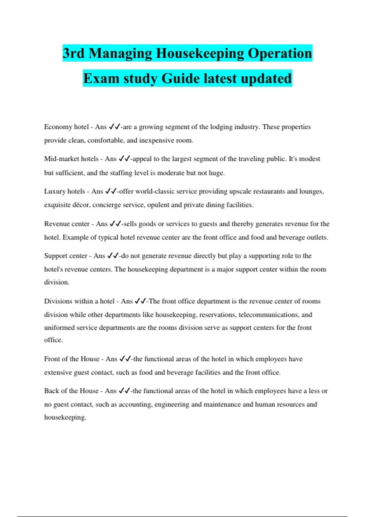 3rd Managing Housekeeping Operation Exam study Guide latest updated 2024